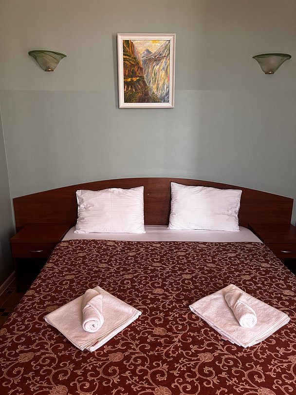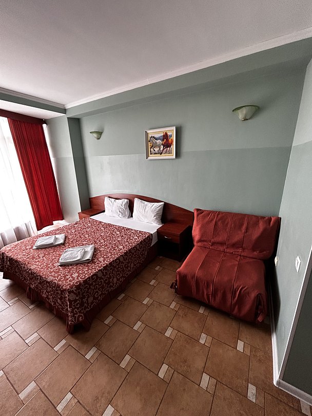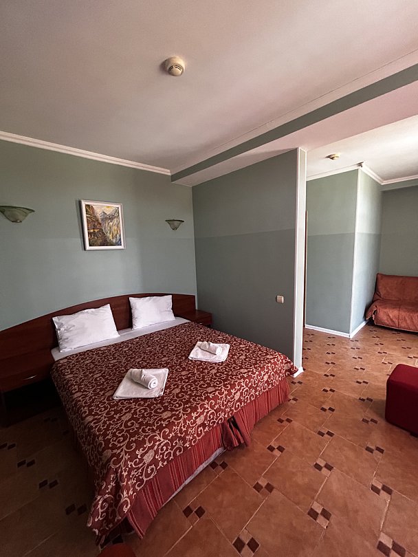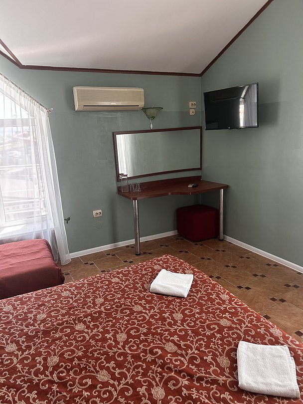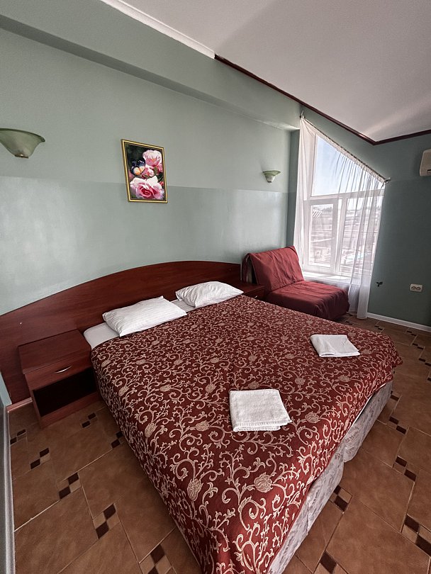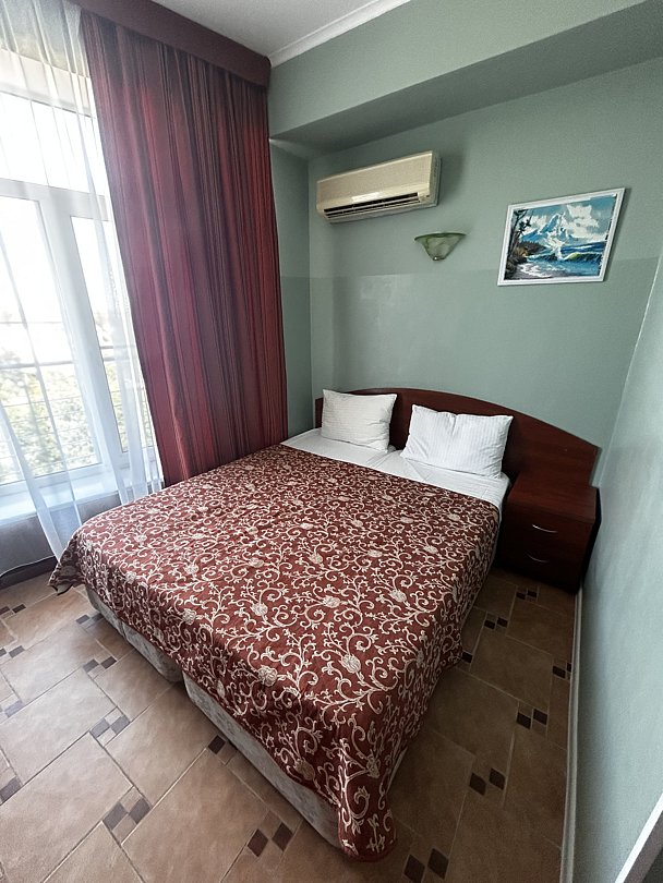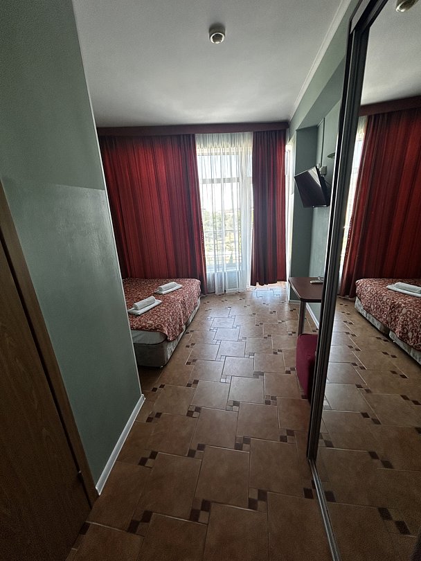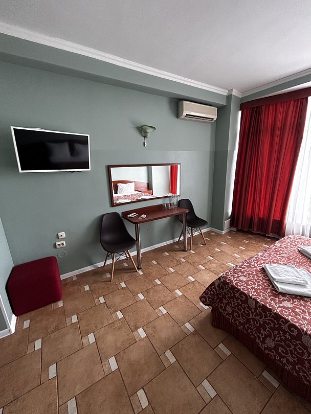 Пятиэтажный корпус отеля возвышается на первой береговой линии в 30 метрах от морского побережья. В распоряжении отдыхающих двух и трехместные номера с балконами. В каждом номере есть автономный санузел, небольшой холодильник, ЖК-телевизор и сплит-система.