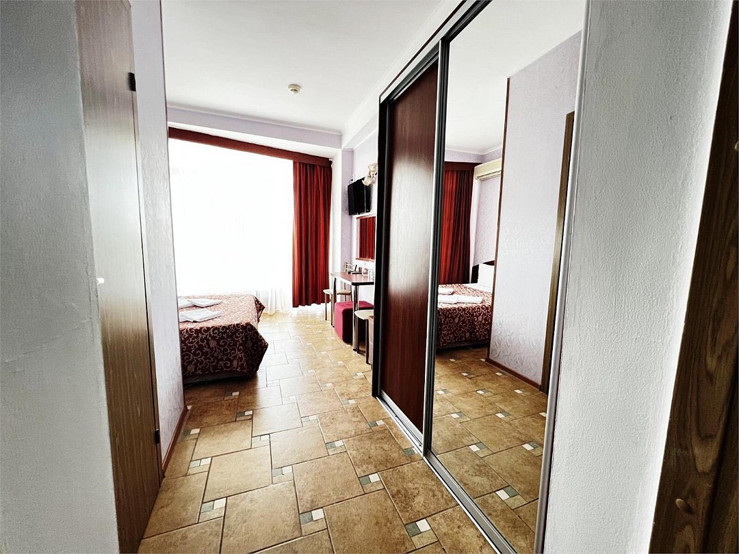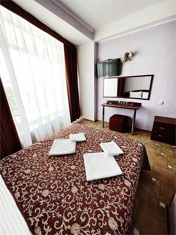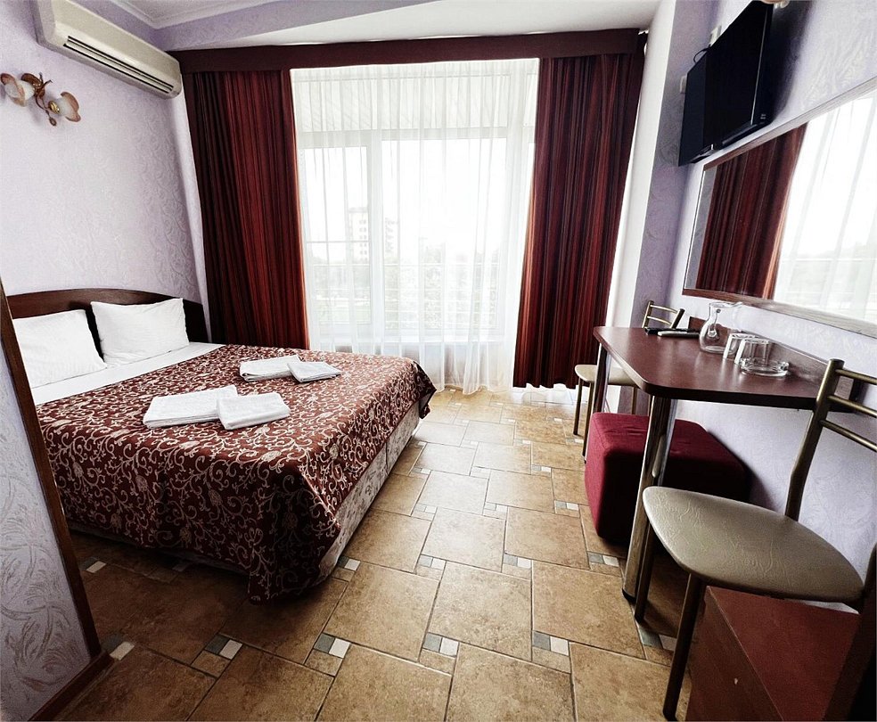 Однокомнатный номер, с двумя спальными местами, с возможностью размещения третьего гостя, с отдельным балконом, с видом на море, прямым или боковым. В номере телевизор, сплит система, холодильник, душевая кабина, туалет, умывальник, сейф, фен, чайник, ортопедические матрасы.Услуги и удобства