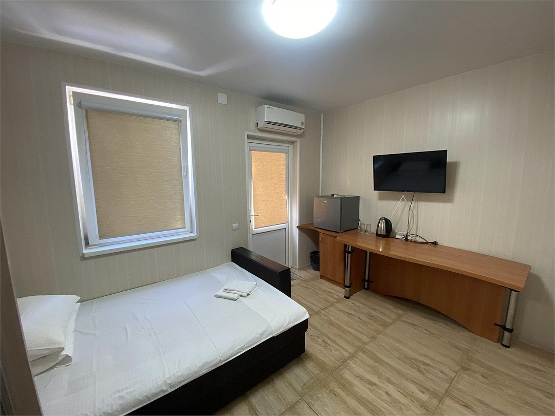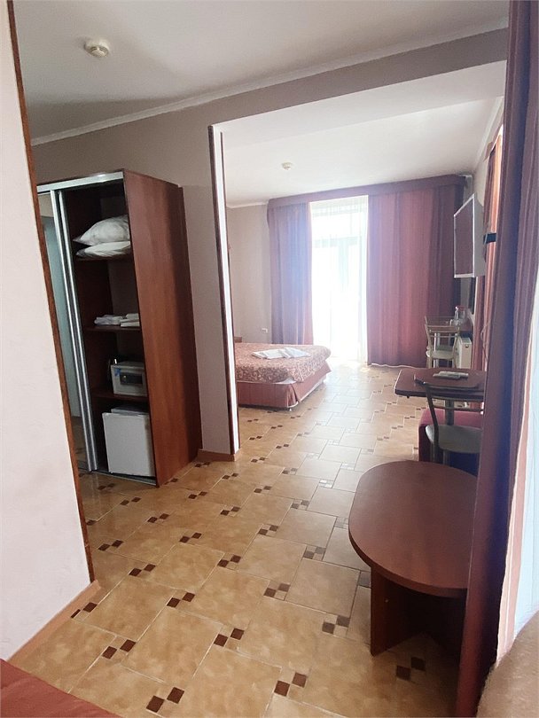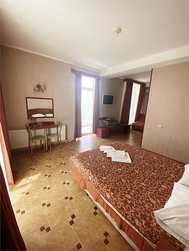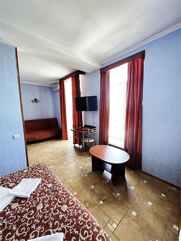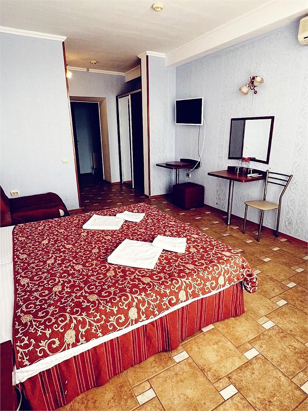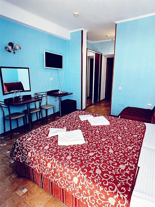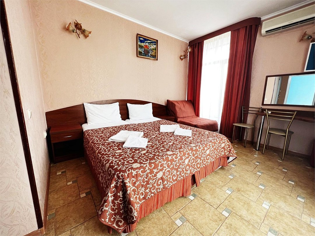 Большой однокомнатный номер, с тремя спальными местами, с возможностью размещения четвертого гостя, с отдельным балконом, с видом на море, прямым или боковым. В номере телевизор, сплит система, холодильник, душевая кабина, туалет, умывальник, сейф, фен, чайник, ортопедические матрасы.Услуги и удобства