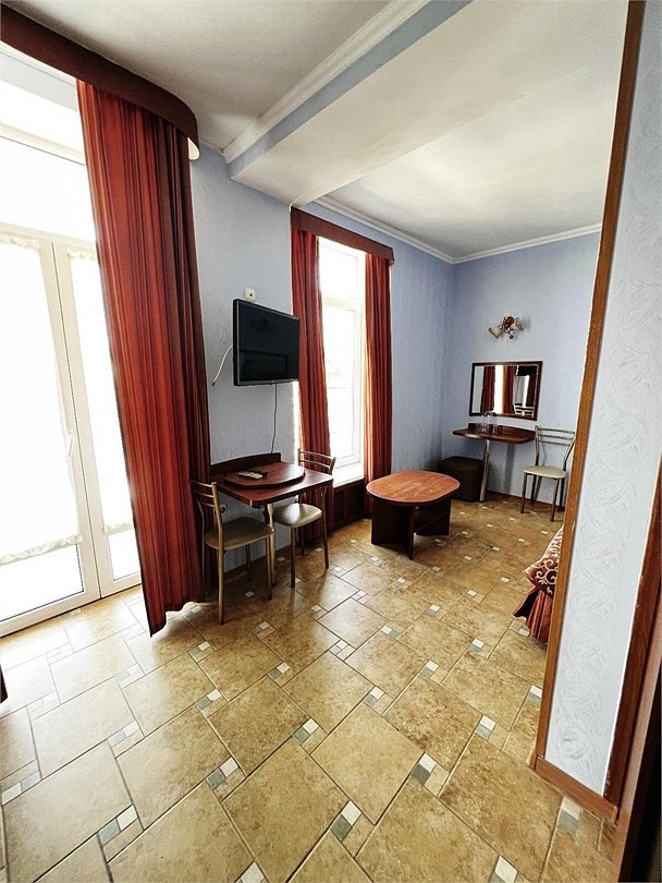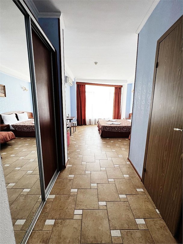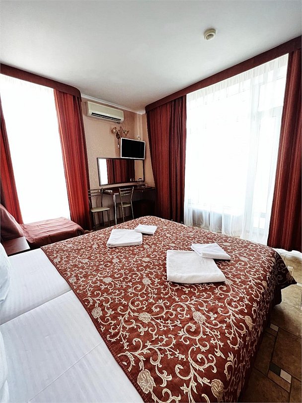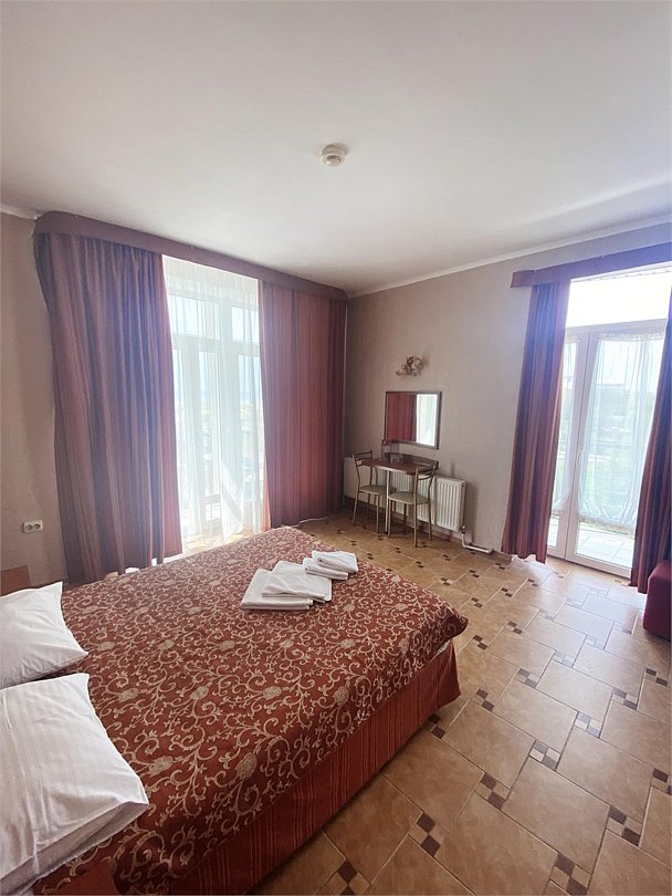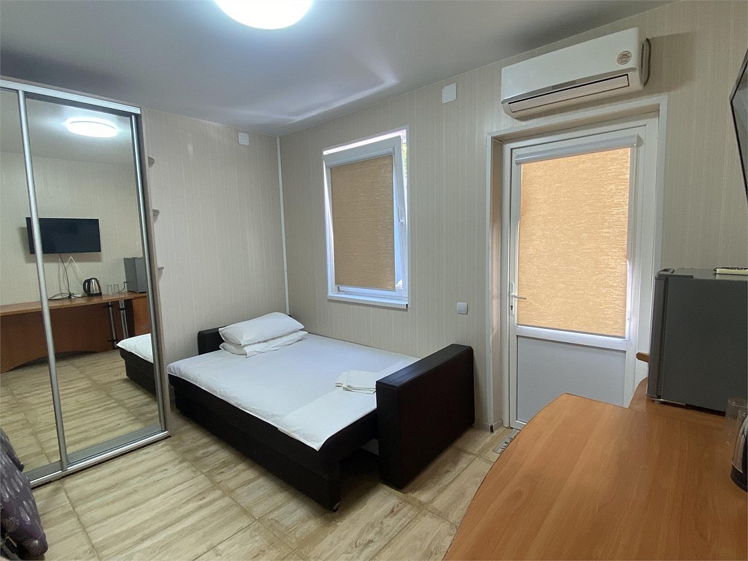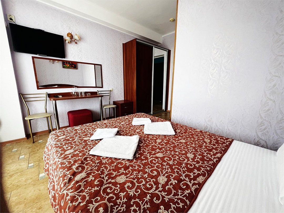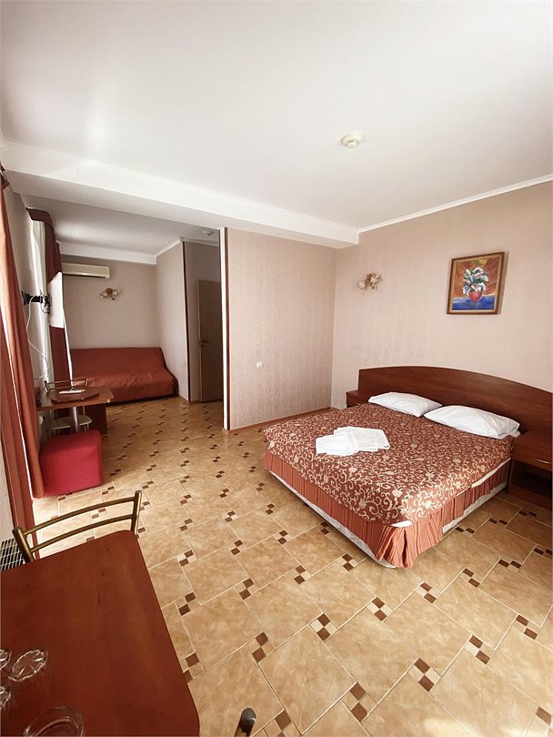 Большой однокомнатный номер, с тремя спальными местами, с возможностью размещения четвертого гостя, с отдельным балконом, с видом на море, прямым или боковым. В номере телевизор, сплит система, холодильник, душевая кабина, туалет, умывальник, сейф, фен, чайник, ортопедические матрасы.Услуги и удобства