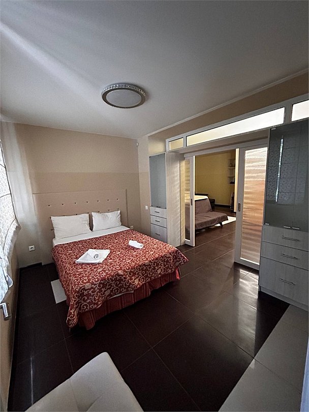 Квартира расположена на первом этаже, с огромной площадью, в ней три комнаты, и ванная, два двуспальных раскладных дивана, одна односпальная кровать и двуспальная кровать. В номере своя кухня, с духовкой, газовой плитой и вытяжкой, посудомоечная машина, в основной комнате телевизор, сплит система, большой холодильник, сейф, фен, чайник, два больших шкафа купе, ортопедические матрасы. В ванной комнате не душ, а ванна, туалет умывальник, также установленна стиральная машина. Это единственный такой номер, самый большой в пансионате.Услуги и удобства