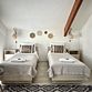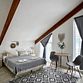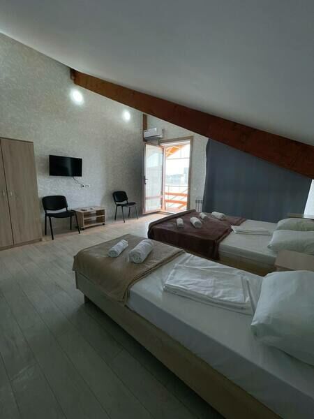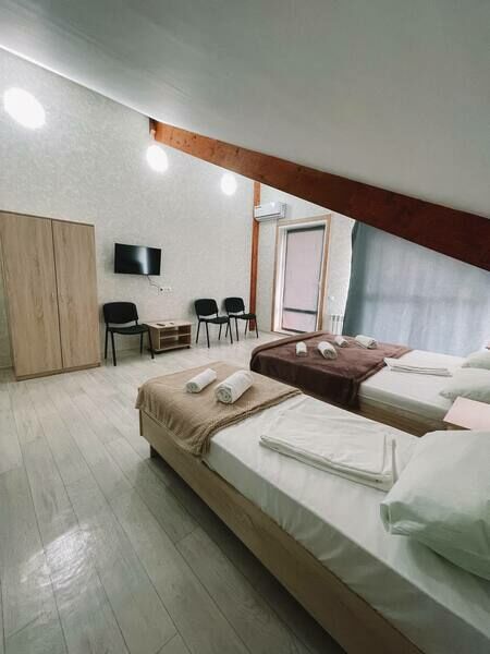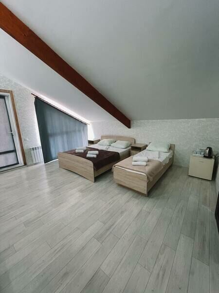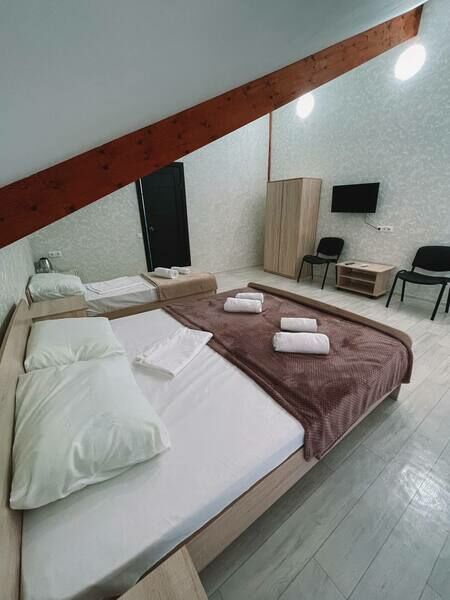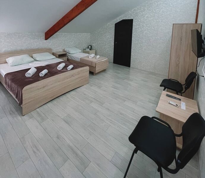две односпальные или одна двуспальная кровати, кондиционер, ТВ, холодильник, чайный набор посуды, электрочайник, с/у с душем. Номера расположены на третьем мансардном этаже.