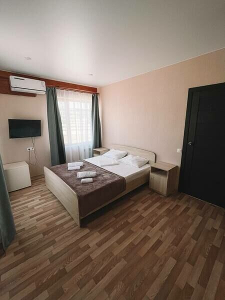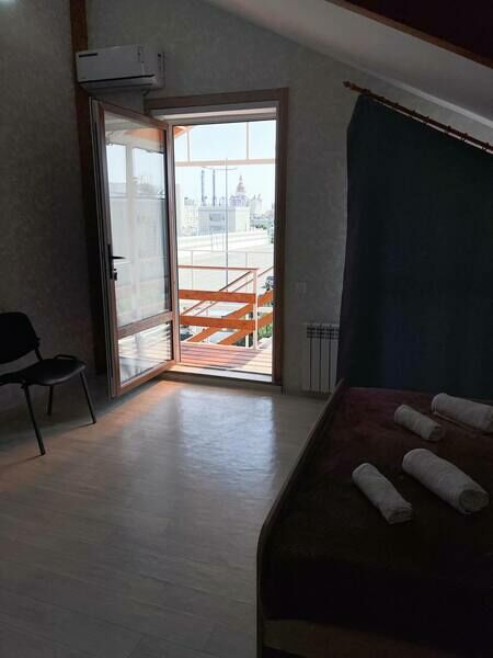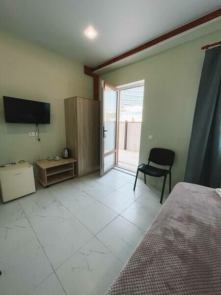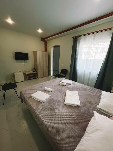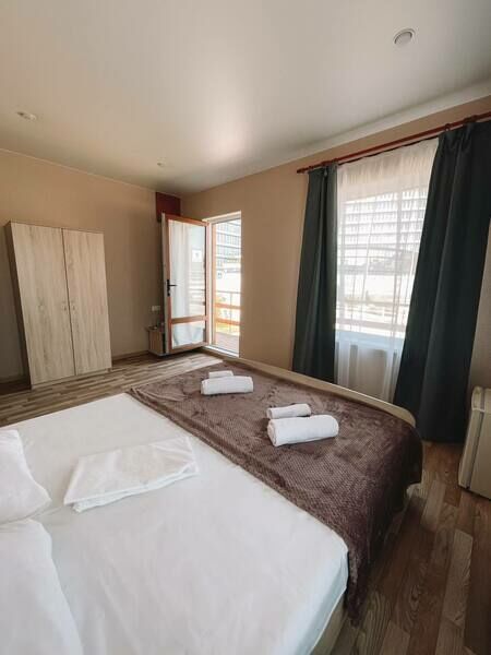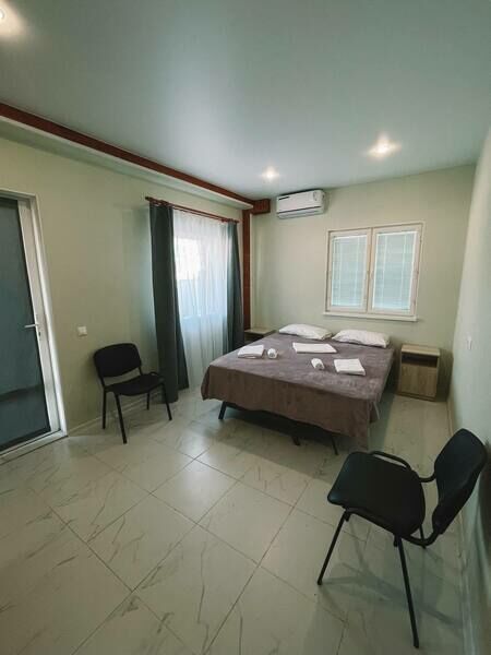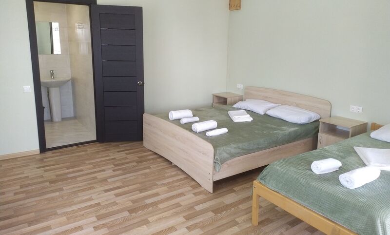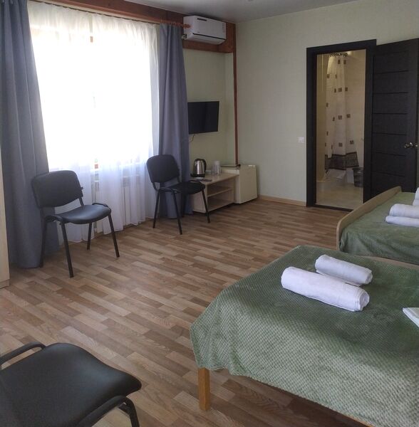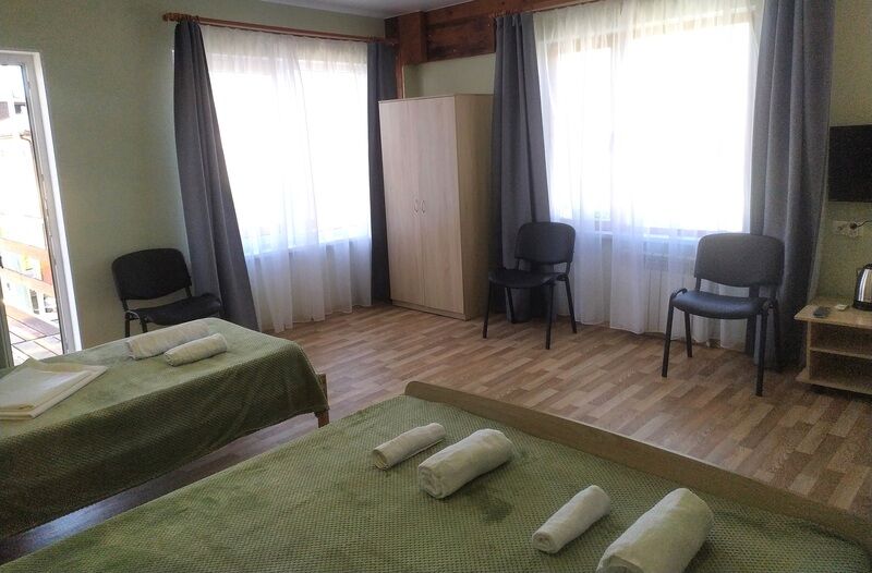 Трехэтажный корпус гостевого дома занимает небольшую закрытую территорию. Жилой фонд, рассчитанный на 25 человек, предлагает гостям двух- и трехместные номера с балконами и без. В каждом номере предусмотрен санузел, есть кондиционер, электрочайник и чайный набор посуды.
