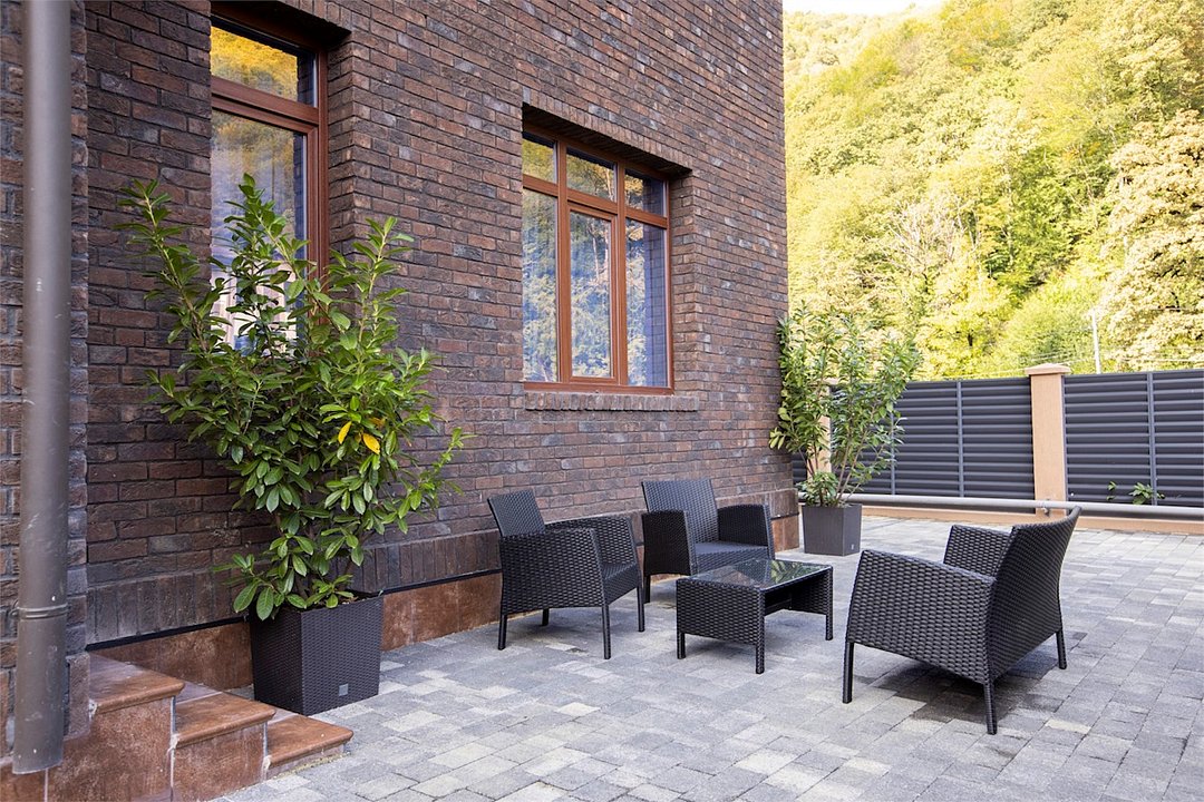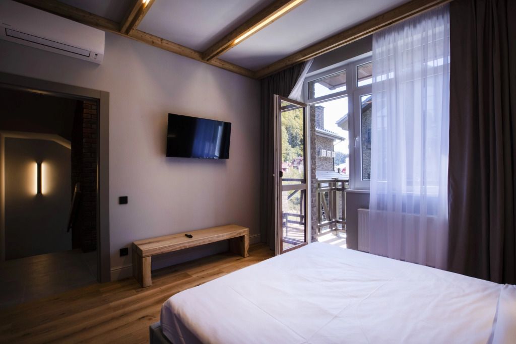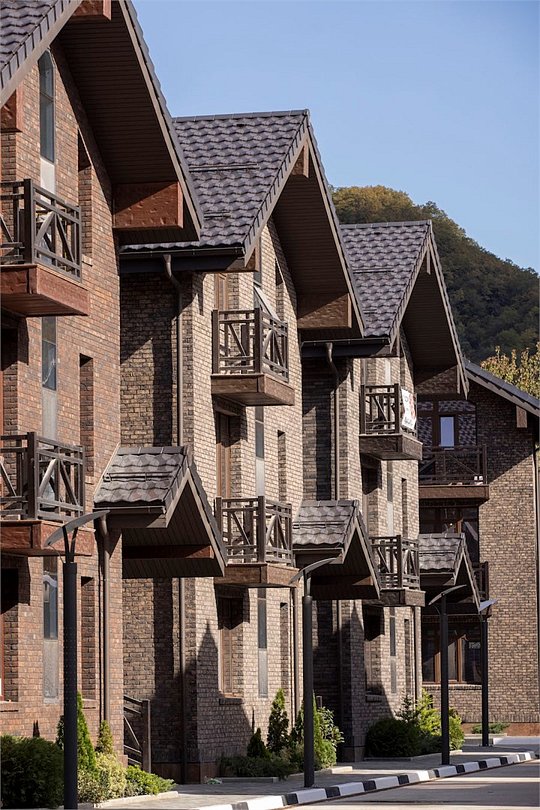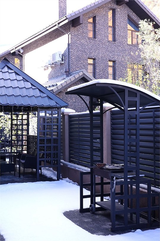 Трехэтажное шале с беседкой и bbq-зоной во внутреннем дворе, вмещает 10 основных и 2 дополнительных места. В каждом шале находятся 5 уютных спален с двуспальными кроватями, по желанию гостей в спальнях могут быть размещены детские кровати. Тишину и комфорт обеспечивают высокотехнологичные стеклопакеты и шторы блэкаут, кондиционеры создают комфортный климат в любое время года. Для всех гостей предоставляются гигиенические наборы, полотенца, халаты, тапочки. Ежедневная уборка шале с заменой белья и полотенец избавит гостей от бытовых хлопот. На первом этаже расположена гостиная комната с кухней, гардероб с принадлежностями для глажки, место для хранение лыжного инвентаря, сейф, стиральная машина, туалетная комната, выход в индивидуальную зону отдыха во внутреннем дворике и барбекю. На втором этаже спальная с выходом на балкон, вторая спальная с собственной ванной комнатой, душевая комната с туалетом на этаже. Третий этаж имеет три спальные комнаты с одной большой кроватью (одна комната с балконом), душ и туалетная комната на этаже. Все спальные комнаты оснащены одной большой кроватью, просторными шкафами, ТВ, кондиционером. Панорамный вид из каждого шале на Кавказские хребты, красота первозданной природы, минутная доступность до всех культурно-развлекательных мест курорта и высококлассный сервис сделает Ваш отдых ярким и незабываемыми.Услуги и удобства