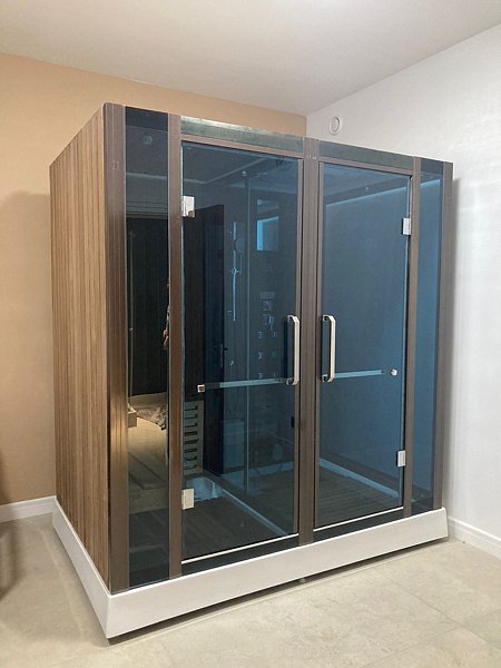Сауна с комнатой отдыха расположены на цокольном этаже коттеджа.