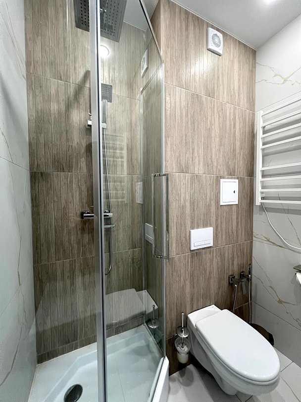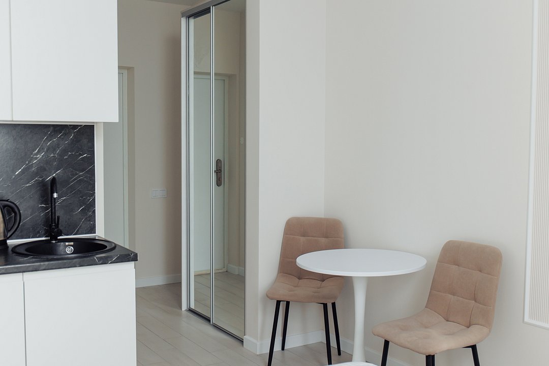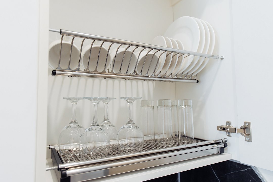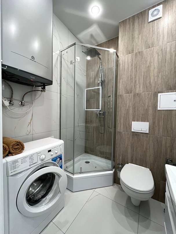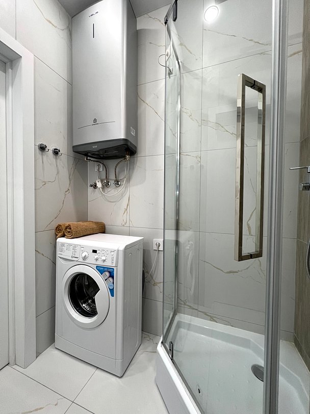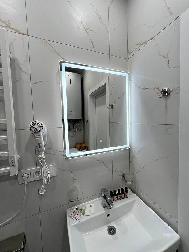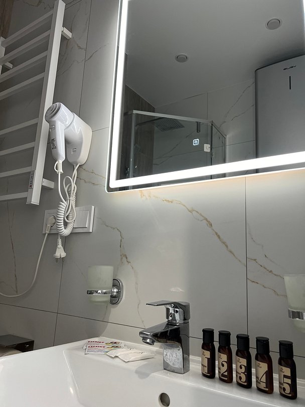 В каждом номере для вашего удобства: варочная панель, вытяжка, холодильник, раковина, микроволновка, чайник и стиральная машина, фен.