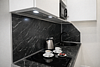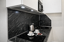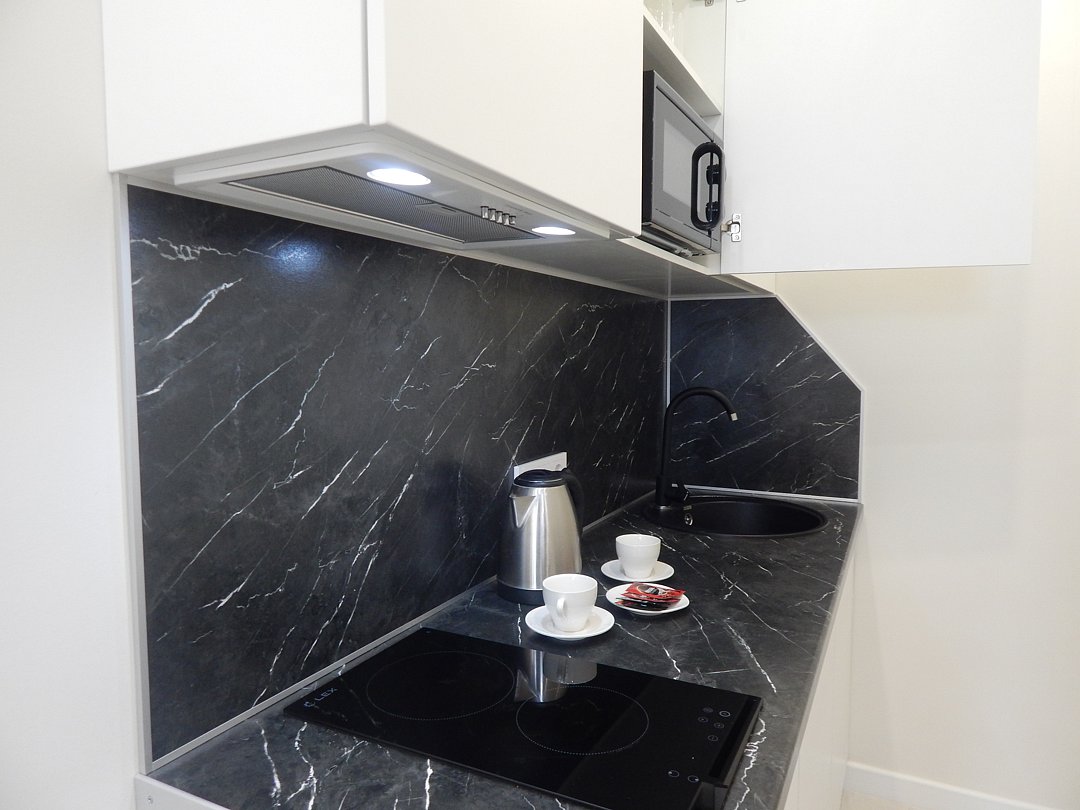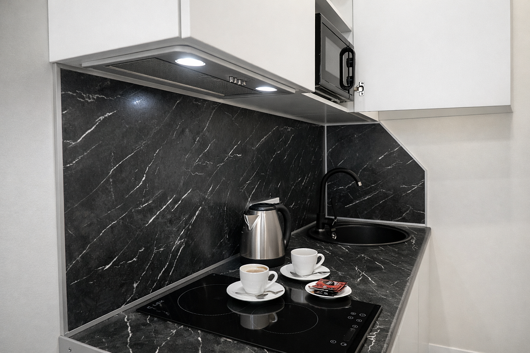 В каждом номере для удобства гостей мини-кухня: варочная панель, вытяжка, холодильник, раковина, микроволновка, чайник и стиральная машина, фен.