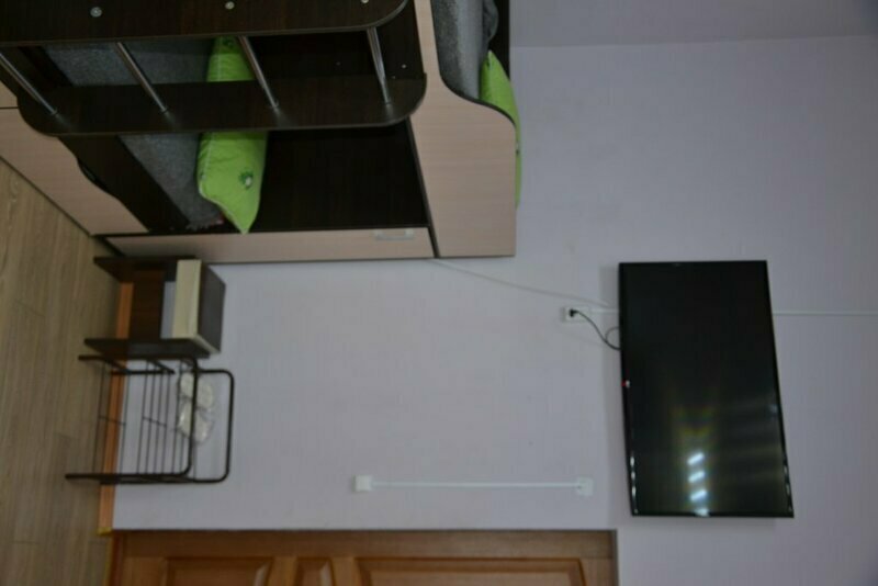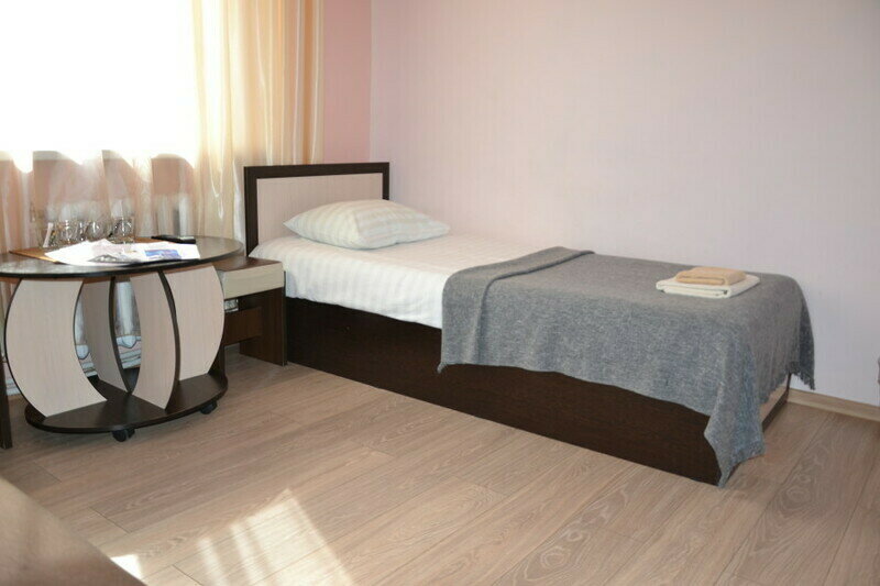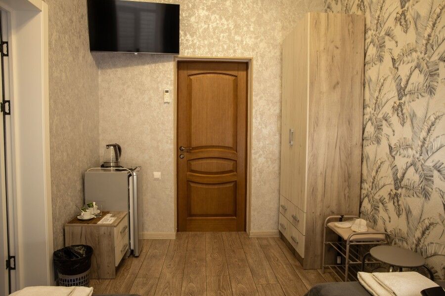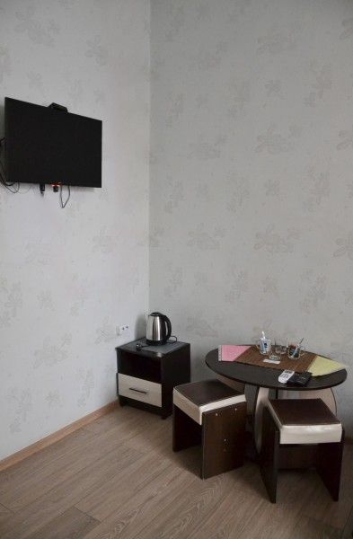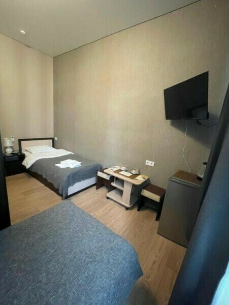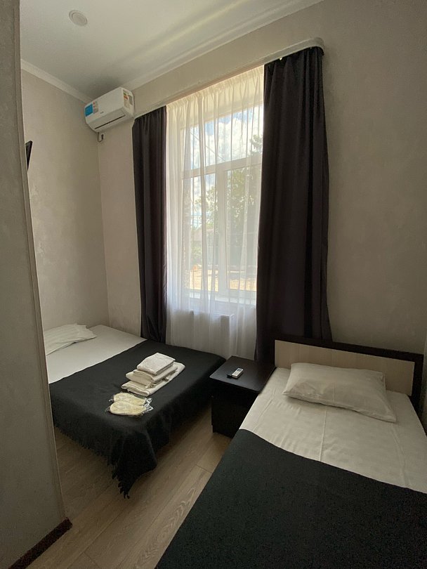 В номере категории «Эконом» установлены две односпальные кровати, а также шкаф, журнальный столик, зеркало, телевизор, кондиционер, холодильник, электрочайник, кружки, чай, сахар, раковина.