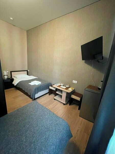 В номере установлены две односпальные кровати, а также есть холодильник, шкаф, прикроватные тумбочки, журнальный столик, телевизор, кондиционер, зеркало, душ, туалет, халат, тапочки, туалетно-косметические принадлежности (зубной набор, гель для душа, шампунь), электрочайник, кружки, чай, сахар.