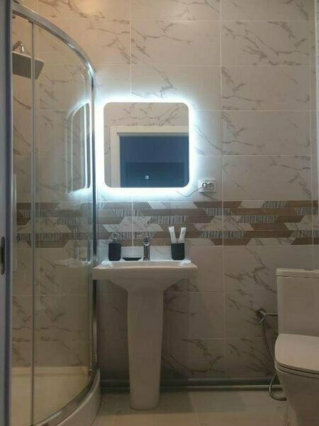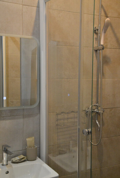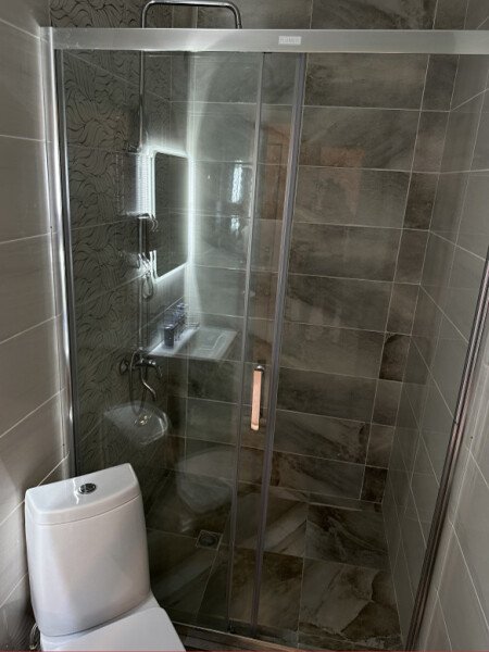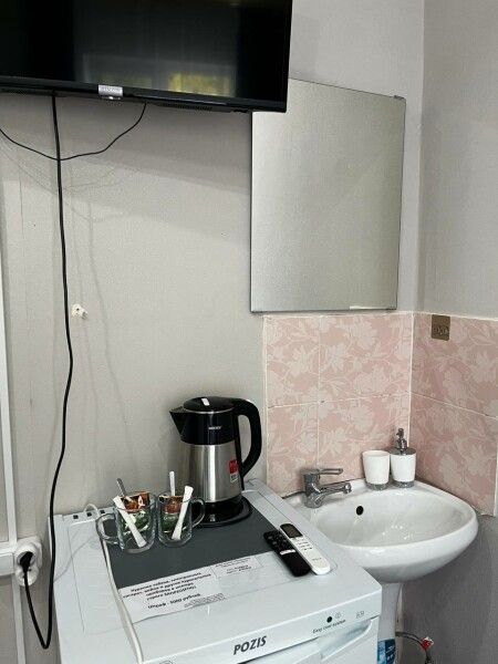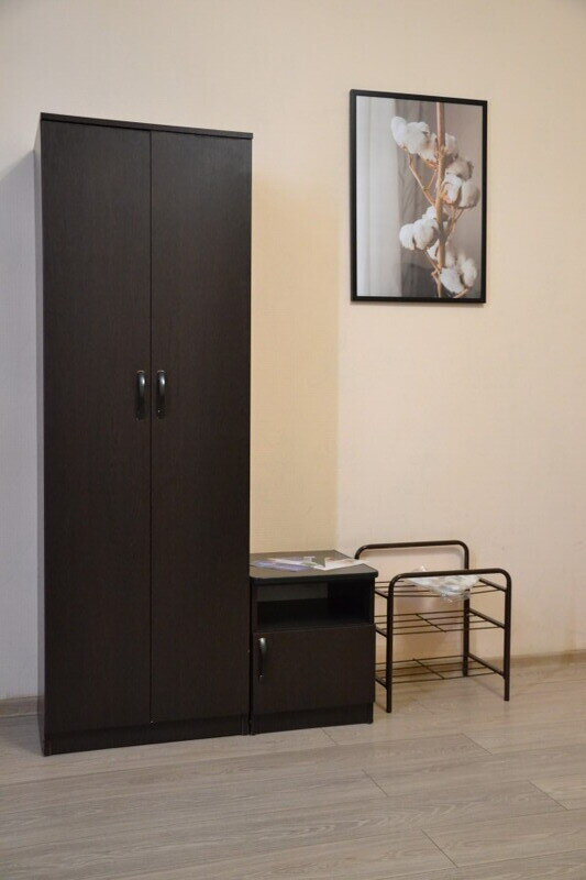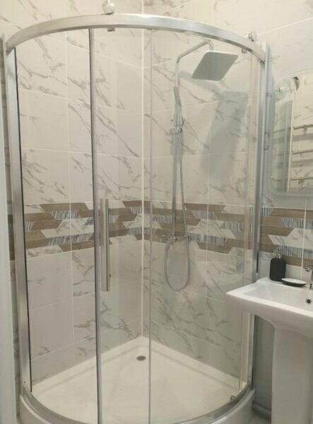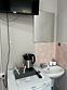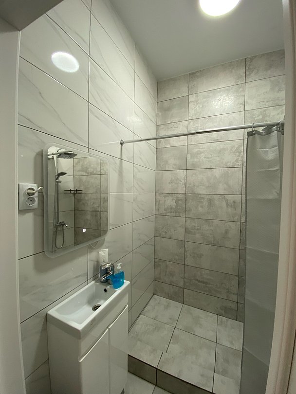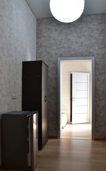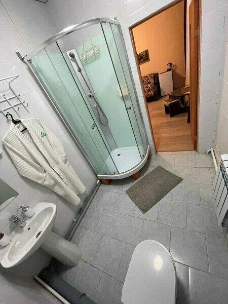 Душ, туалет, утюг, кухня с холодильником, микроволновка и электрочайник общие расположен в холле.