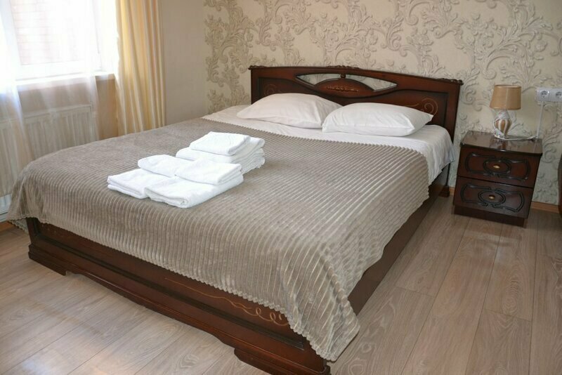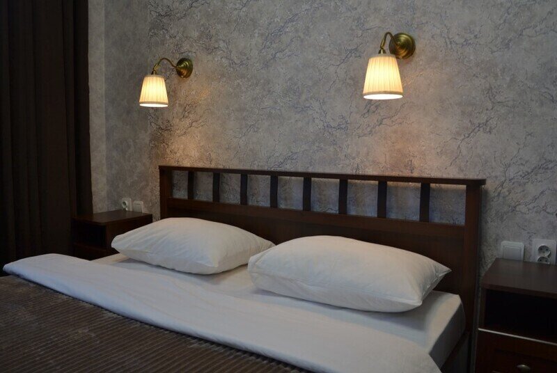 В номерах установлена большая двуспальная кровать, а также есть холодильник, шкаф, прикроватные тумбочки, журнальный столик, телевизор, кондиционер, зеркало, душ, туалет, халат, тапочки, туалетно-косметические принадлежности (зубной набор, гель для душа, шампунь), электрочайник, кружки, чай, сахар.