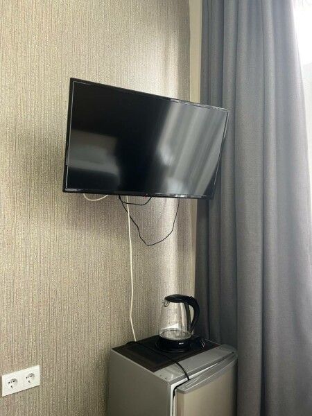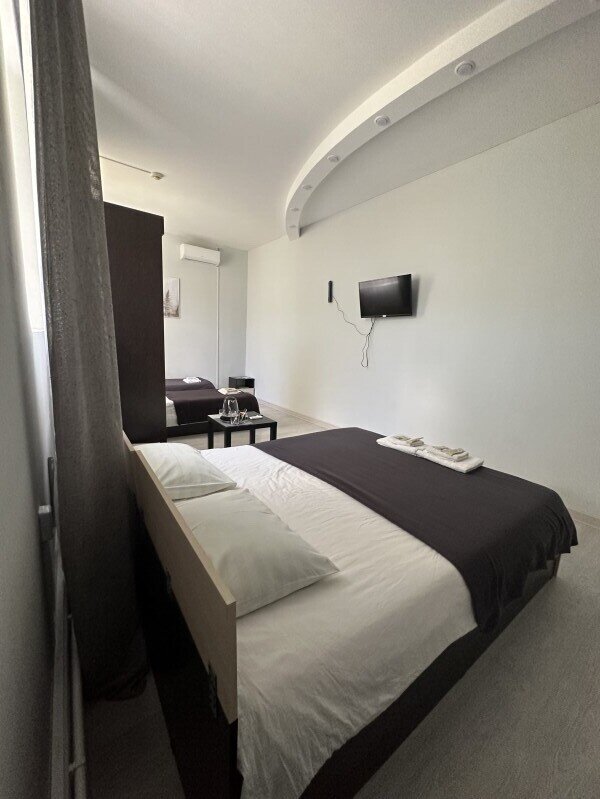 В номере одна двуспальная кровать и две односпальные кровати, шкаф, стол, стулья, тумбочки, вешалка, холодильник, электрочайник, кружки, чай, сахар. Номер оборудован телевизором, кондиционером.