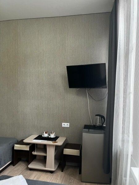 В номере установлены две односпальные кровати для отдыха и проживания до 2 человек, а также шкаф, журнальный столик, зеркало, телевизор, кондиционер, электрочайник, кружки, чай, сахар.