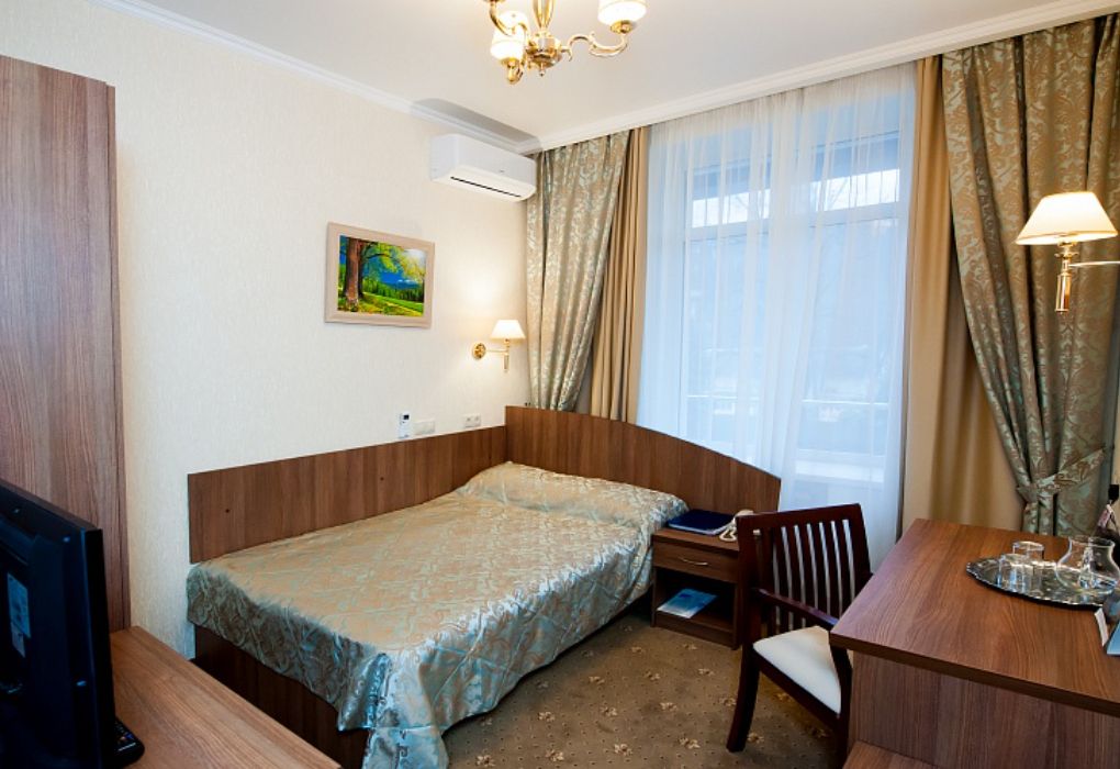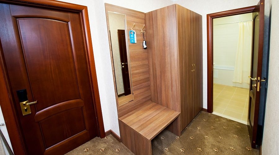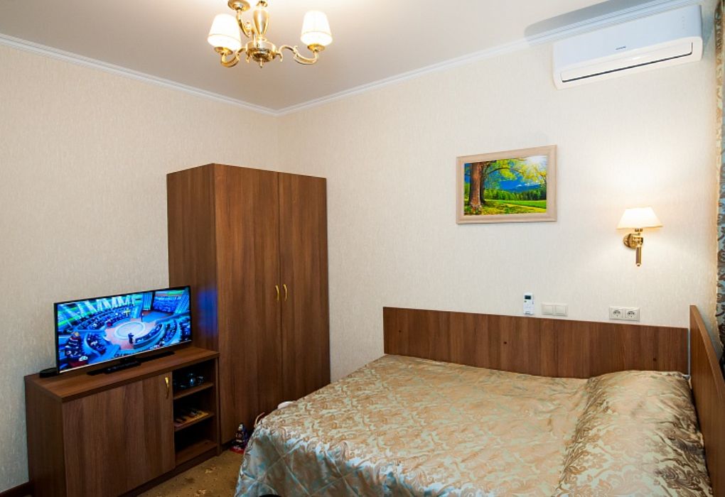 В номере: ковровое покрытие, полуторная кровать (120х200), письменный стол, стул-кресло, шифоньер, тумба под багаж, зеркало, телевизор с дистанционным управлением, телефон, электрочайник и набор посуды, холодильник, сплит-система, сейф.