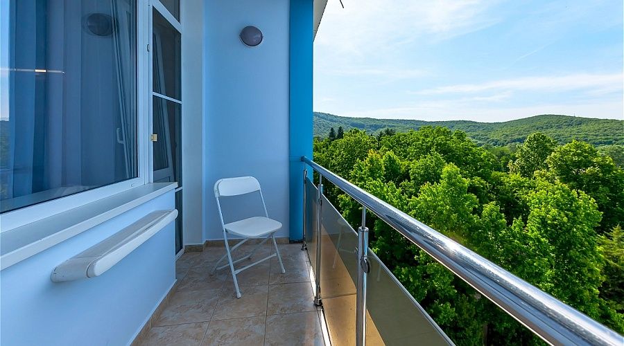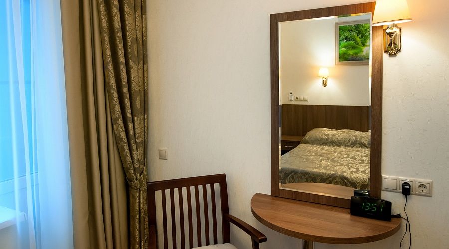 Номер первой категории с лоджией, оформлен в стиле модерн, идеально подходит для супружеских пар. Номера данной категории расположены на втором этаже здания. Вид из окна на внутренний двор санатория.