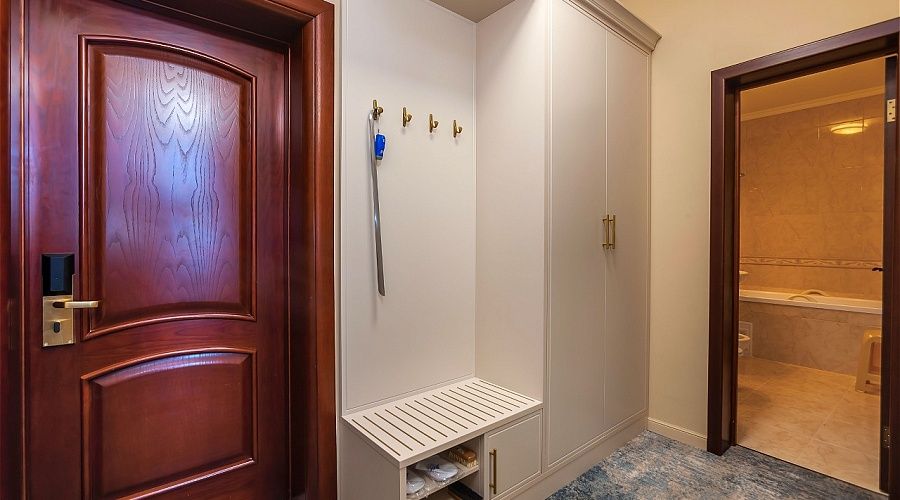 В номере: ковровое покрытие, двуспальная кровать 160х200 (также может быть установлена детская кроватка за дополнительную оплату), диван, туалетный стол, пуфик, гардероб, тумба под багаж, зеркало, телевизор с дистанционным управлением, холодильник, сплит-система, телефон, электрочайник, гладильная доска и утюг, сейф.