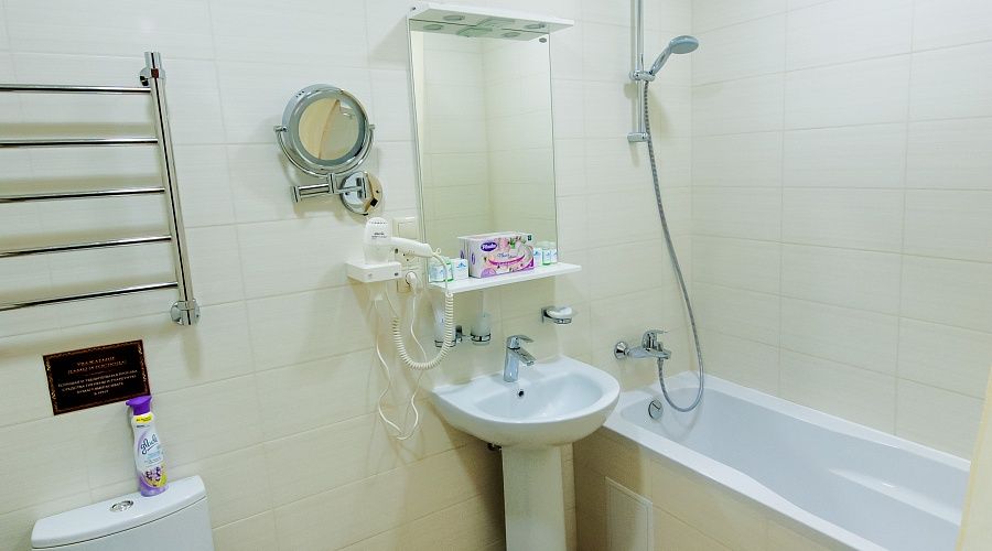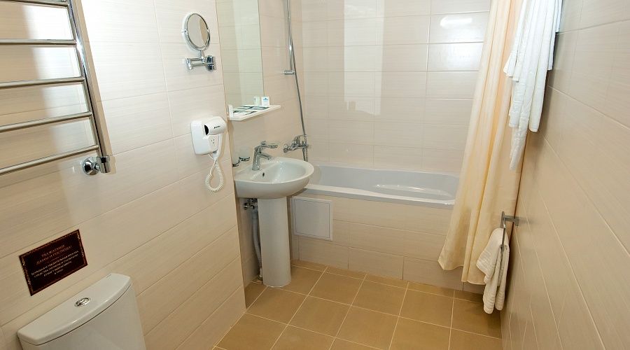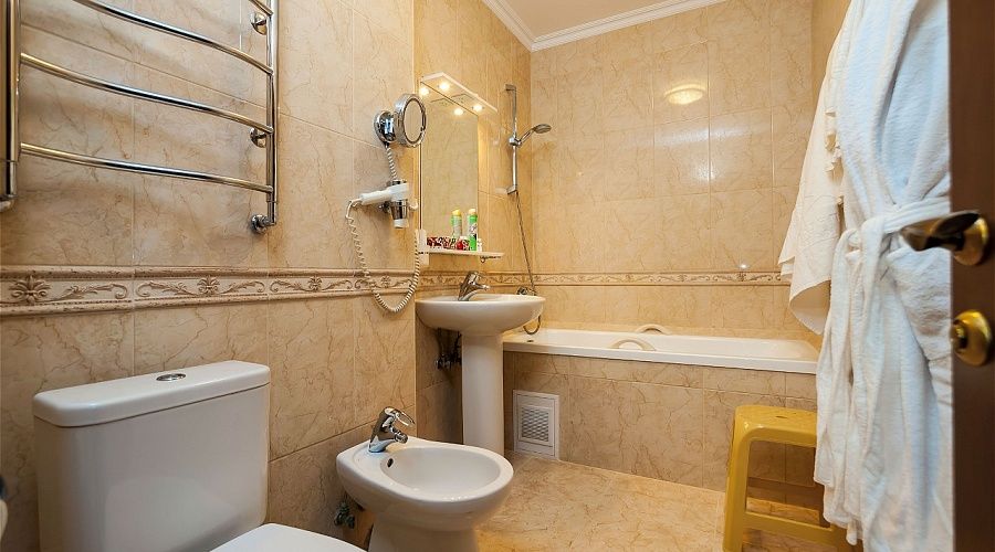 В номере совмещенный санузел (ванна, туалет, биде, раковина) с банными принадлежностями (халат и тапочки) и гигиеническим набором (шампунь, мыло, гель и шапочка для душа), фен.