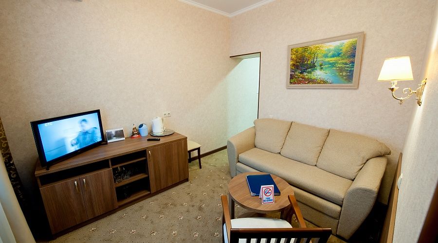 В номере: двуспальная кровать (180х200, раздвигается на две отдельные 90х200), также может быть установлена детская кроватка за дополнительную плату; ковровое покрытие, диван, письменный стол, стул-кресло, гардероб, тумба под багаж, зеркало, телевизор с дистанционным управлением, холодильник, сплит-система, телефон, гладильная доска и утюг, электрочайник и набор посуды, сейф.