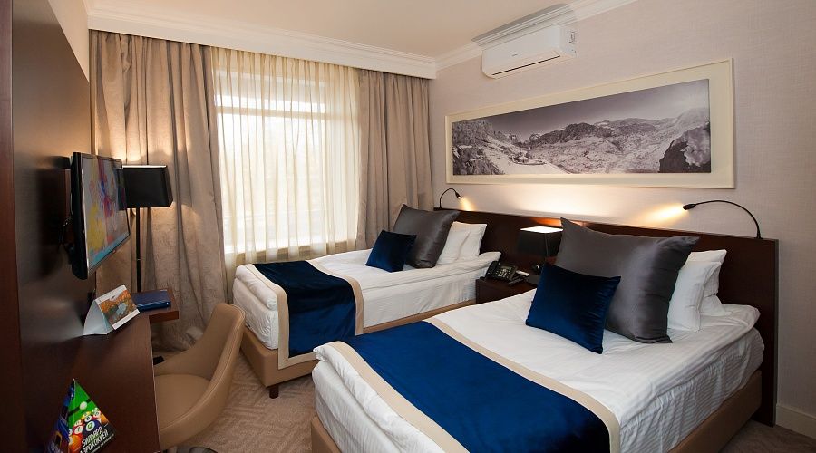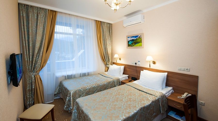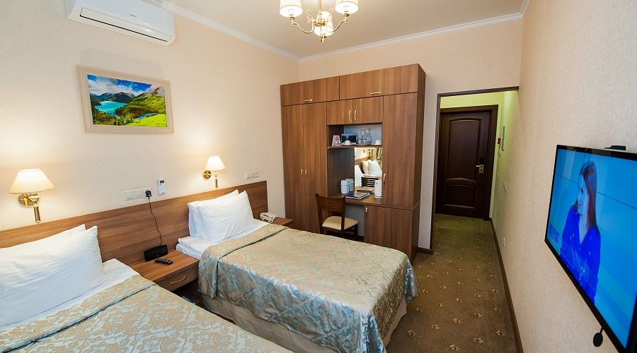 В номере: ковровое покрытие, две односпальных кровати (90х200), письменный стол, стулья, шифоньер, тумба под багаж, зеркало, телевизор с дистанционным управлением, телефон, электрочайник и набор посуды, холодильник, сплит-система, сейф.
