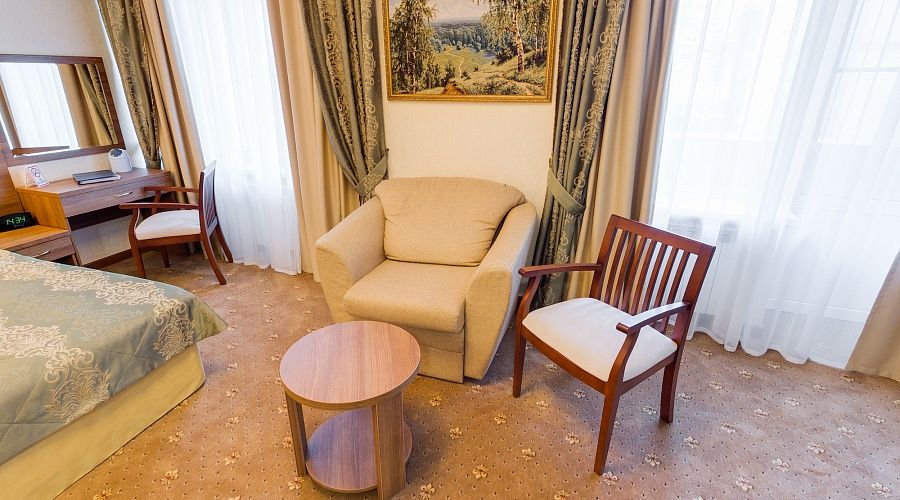 В номере: ковровое покрытие, двуспальная кровать (160х200) или две односпальных кровати (90х200), гардероб, телевизор, торшеры и настольные лампы, кресло, тумбы прикроватные, сплит-система, охлаждающий мини-бар, гладильная доска с утюгом, телефон и электрочайник, фен, напольные весы, сейф.