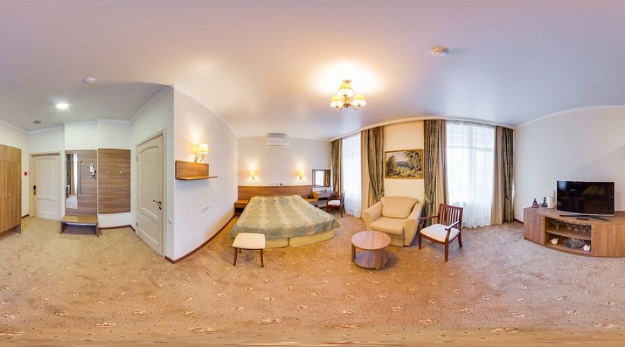 Двухкомнатный номер высшей категории с лоджией. По-европейски сдержанный стиль интерьера, мягкие бежевые оттенки, натуральный текстиль. Номера данной категории расположены на седьмом этаже здания. Вид из окна на внутренний двор санатория (с перспективой на горы).