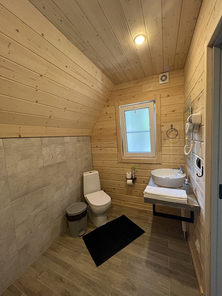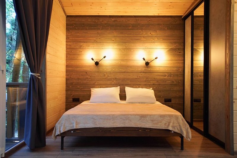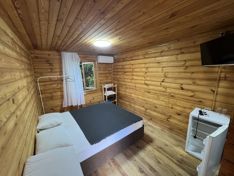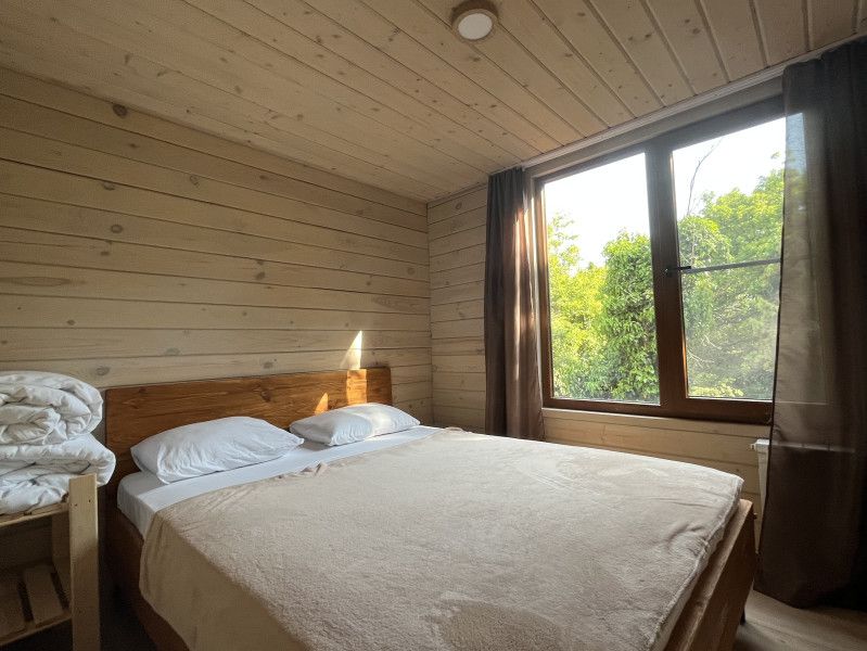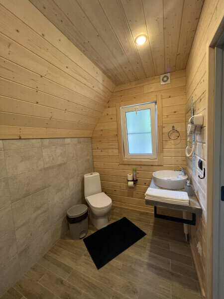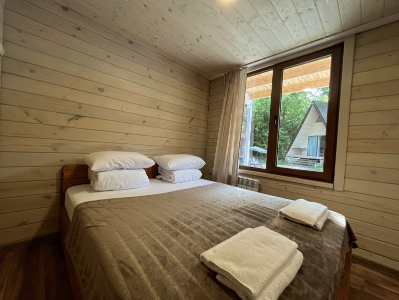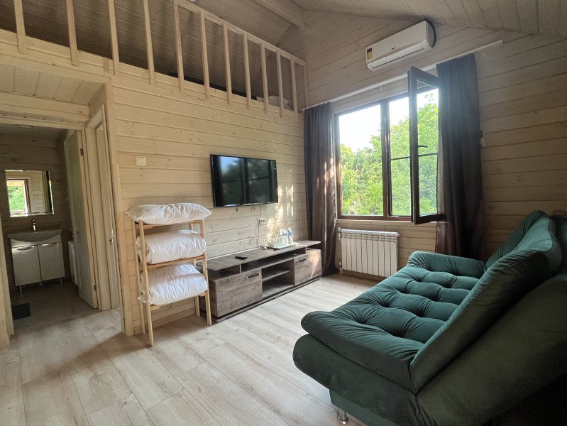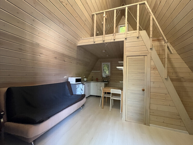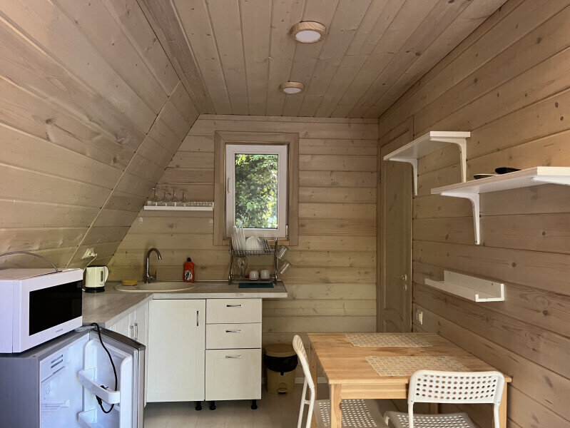 В номере: кухня-гостинная с мансардным этажом, спальня, санузел, маленькая терраса, мангальная зона.
