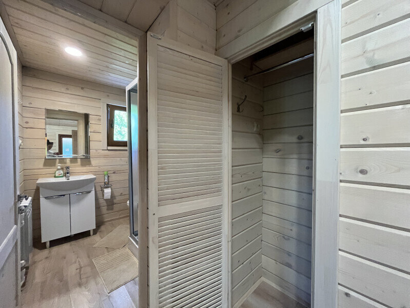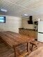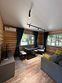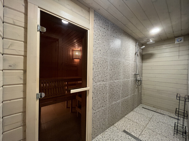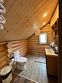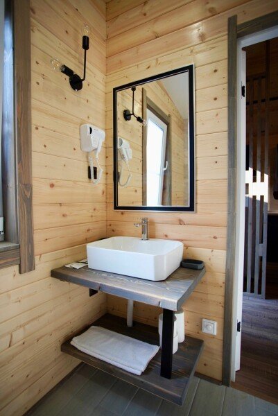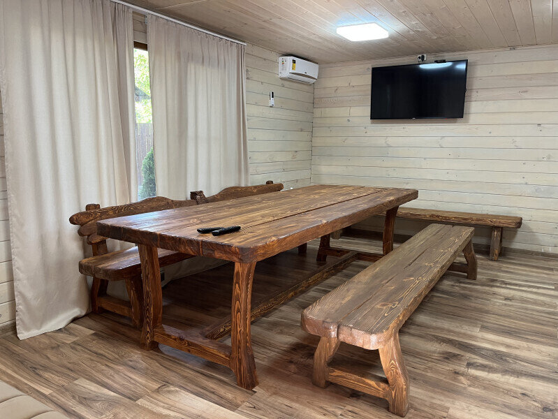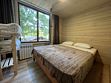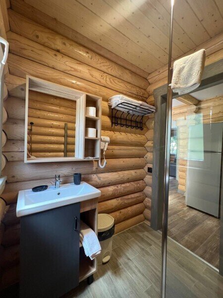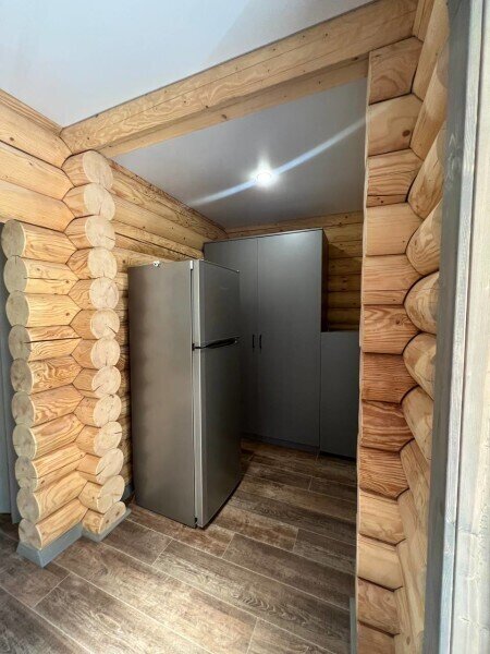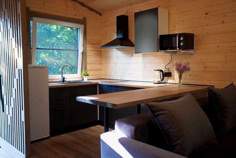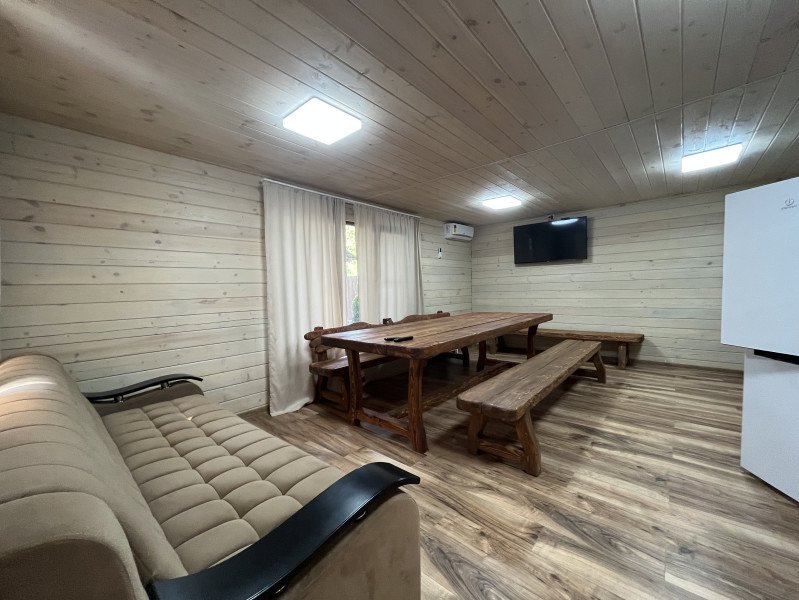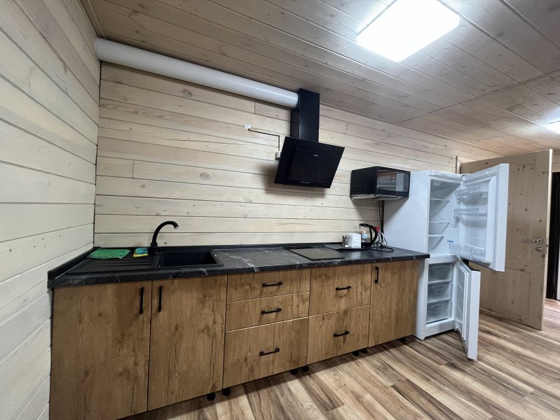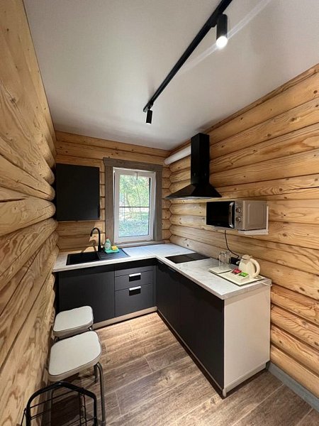 Новый номер с кухней из сруба на 4-5 человек (1 этаж). На этаже — спальня на двоих, гостиная с двуспальным диваном и креслом-кроватью, полностью укомплектованная кухня, санузел с душем, выход на мини-террасу, мангальная зона.
