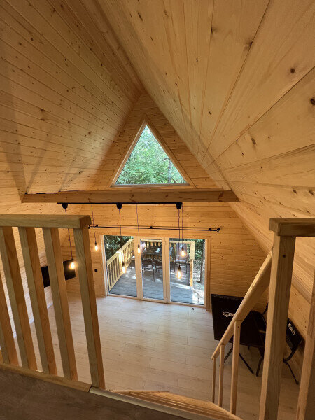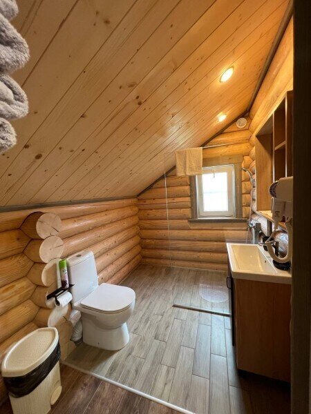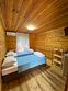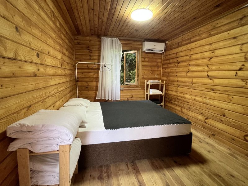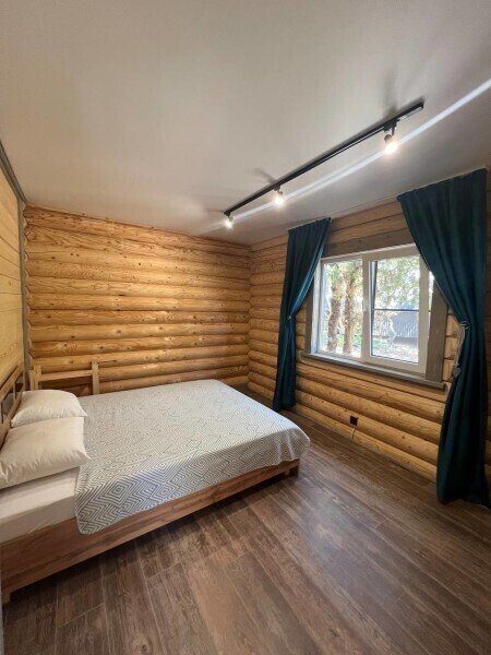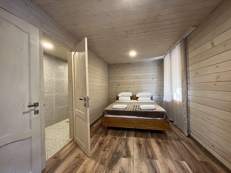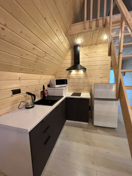 Новый номер с кухней из сруба на 4 человека (2 этаж). На этаже — 2 спальни с двуспальной кроватью, мини-кухня, санузел с душем, выход на балкон, мангальная зона.