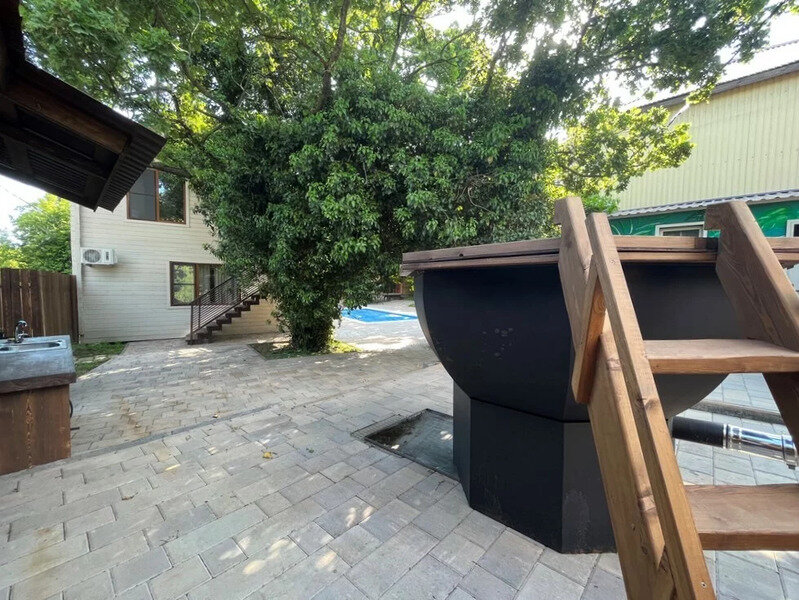 Отдельная от всех зона с открытым бассейном и шезлонгами, двумя большими беседками с мангалами и холодильником, душевыми и санузлом. В зоне помещается до 28 человек.