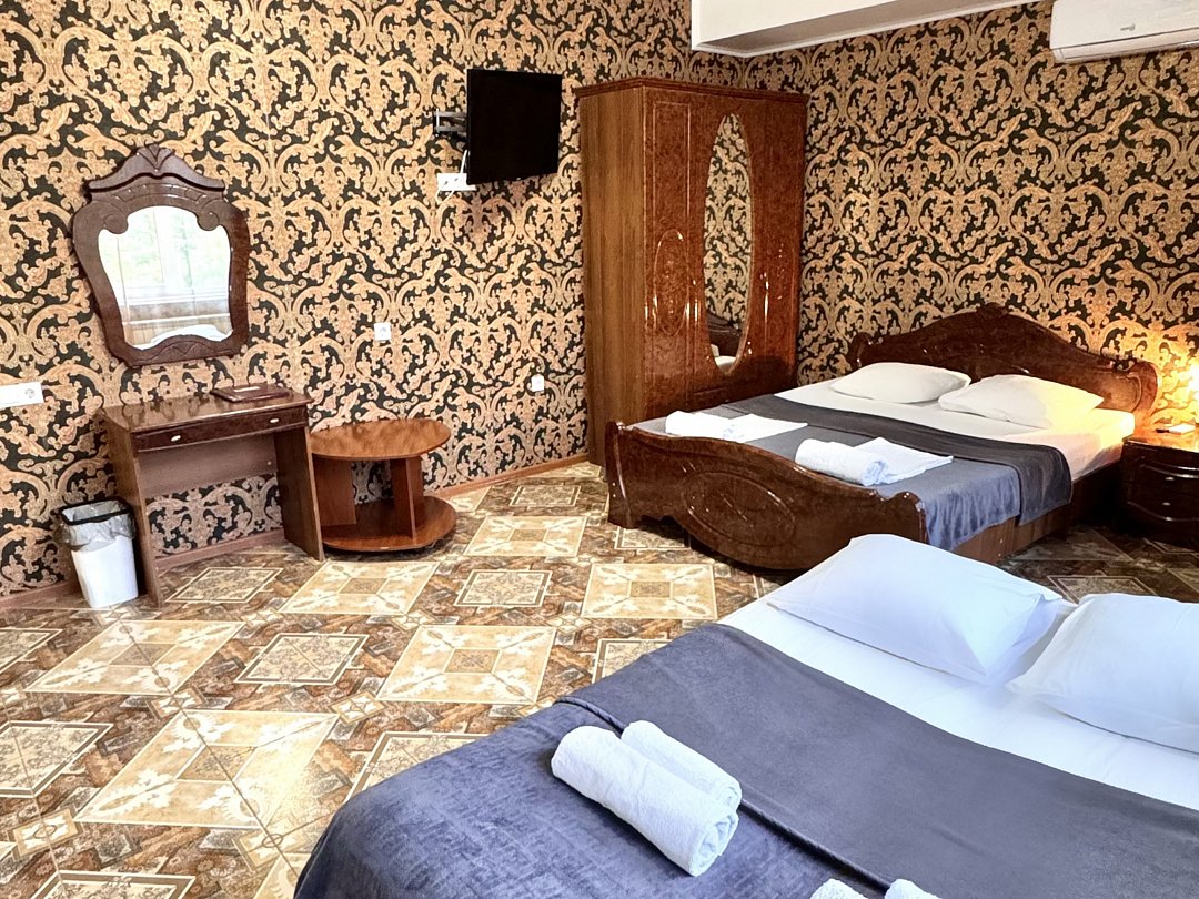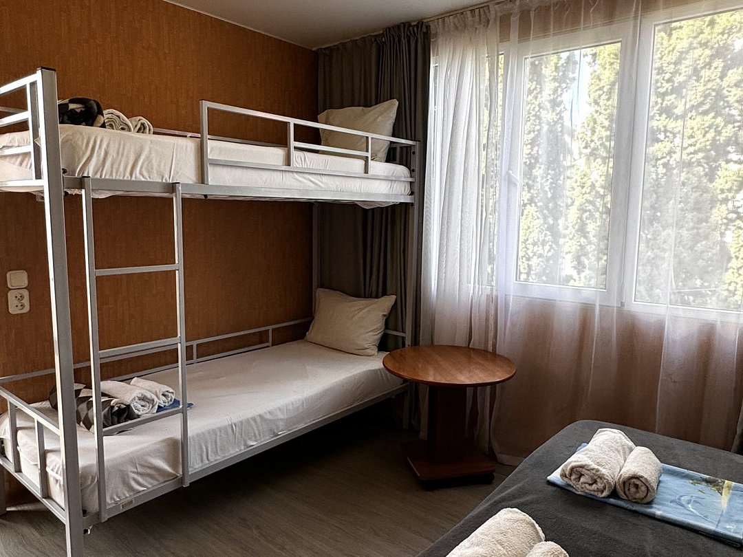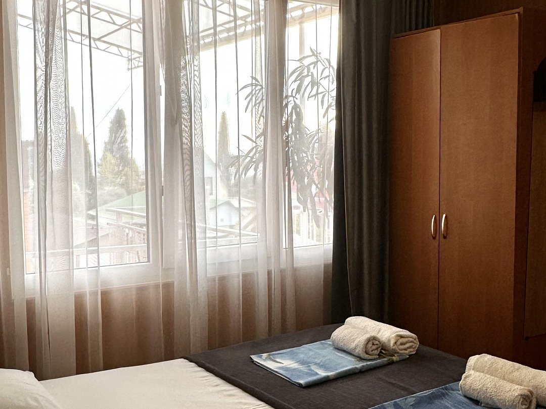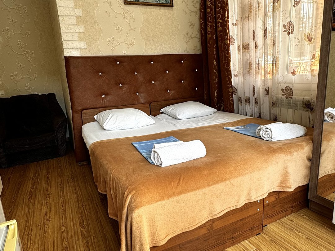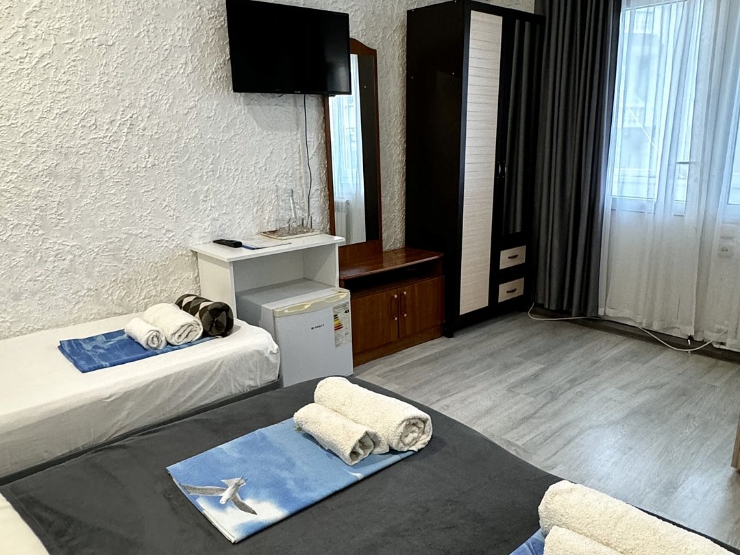 Уютный номер Четырехместный эконом "Комфорт+" располагается в самом центре Адлера на первой береговой линии с развитой инфраструктурой досуга и развлечений в пешей доступности. В указанном номере предоставляется: ТВ, сплит-система, холодильник, чайник, фен, средства гигиены, все пляжные принадлежности. На закрытой территории расположены лаундж-зона, детская площадка, платная парковка авто.В номере