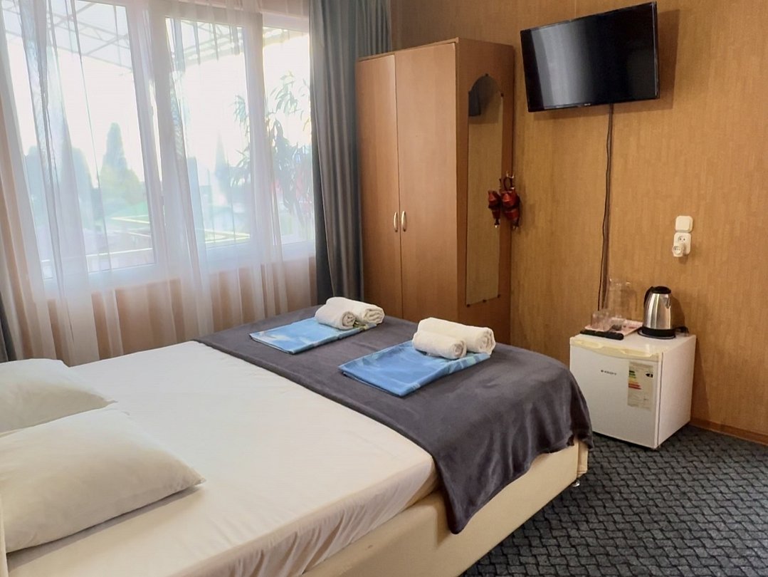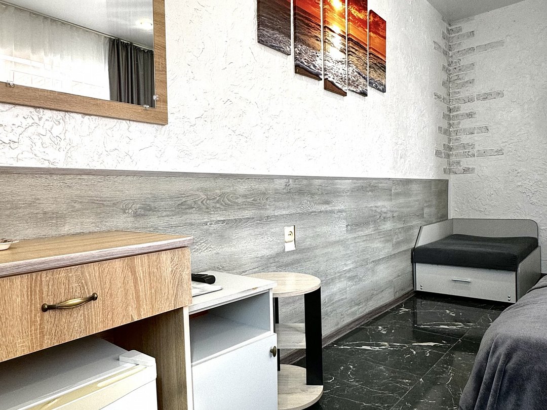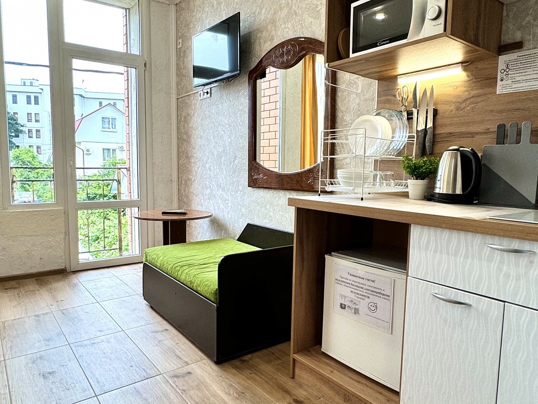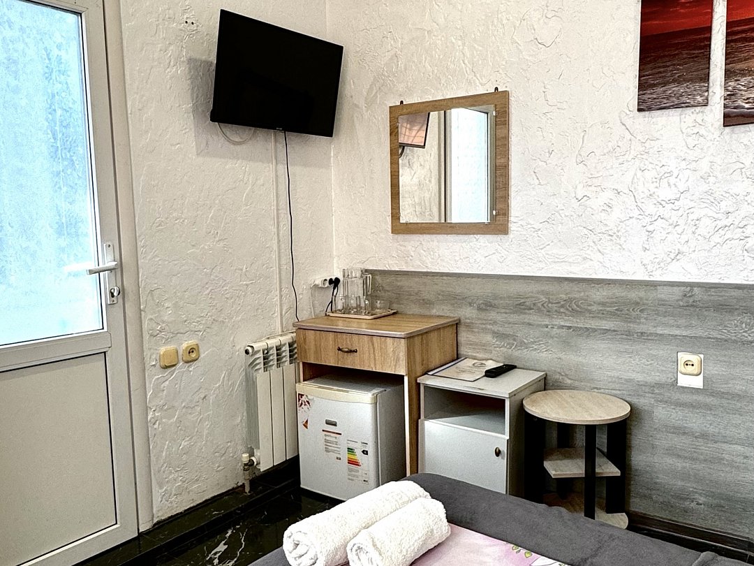 Номер эконом "комфорт+" располагается в самом центре Адлера на первой береговой линии с развитой инфраструктурой досуга и развлечений в пешей доступности. В указанном номере предоставляется: посуда и кухонные принадлежности, душ, туалет, балкон, ТВ, сплит-система, холодильник, чайник, фен, средства гигиены, все пляжные принадлежности. На закрытой территории расположены лаундж-зона, детская площадка, платная парковка авто.В номере