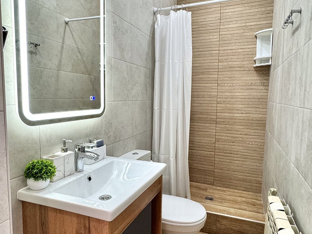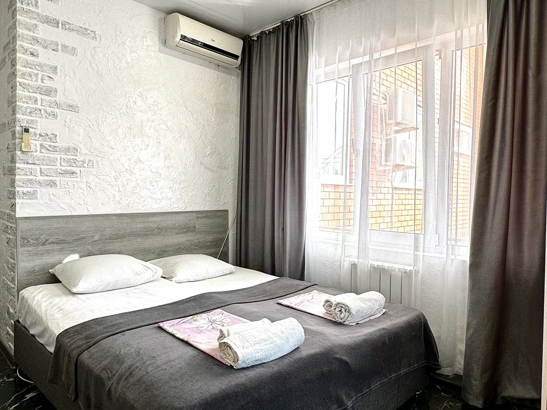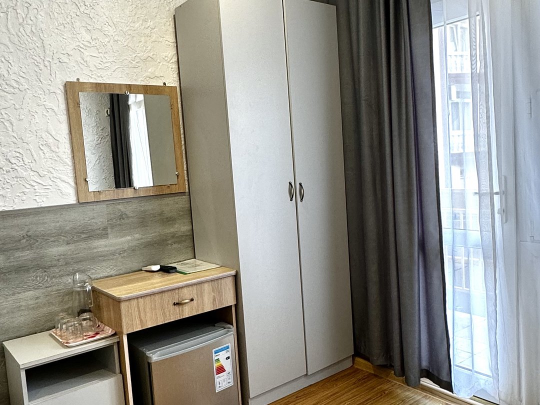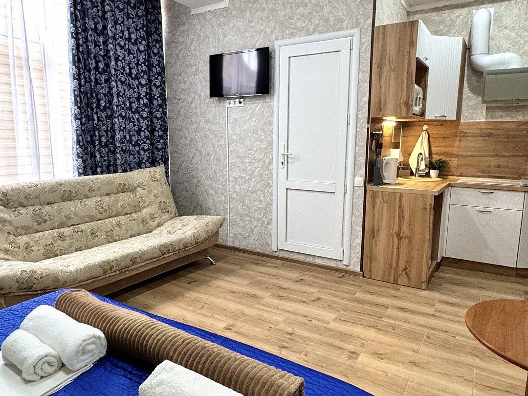 Номер эконом "комфорт+" располагается в самом центре Адлера на первой береговой линии с развитой инфраструктурой досуга и развлечений в пешей доступности. В указанном номере предоставляется: посуда и кухонные принадлежности, душ, туалет, балкон, ТВ, сплит-система, холодильник, чайник, фен, средства гигиены, все пляжные принадлежности. На закрытой территории расположены лаундж-зона, детская площадка, платная парковка авто.В номере