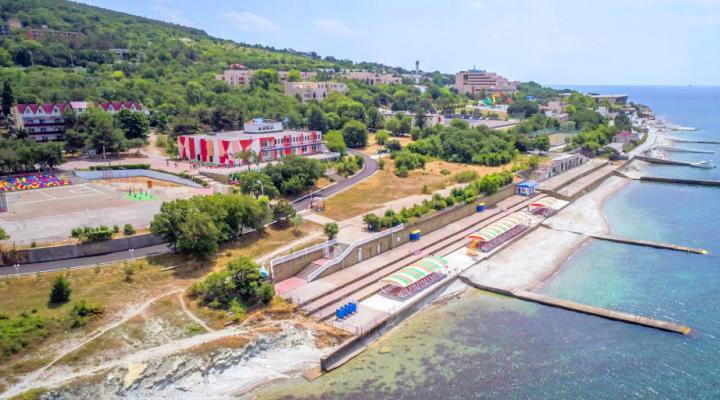 Лагерь расположен в отдалении от центра на обособленной территории. Поэтому шум курортного поселка не мешает спокойному и безопасному отдыху детей. Территория лагеря большая, прекрасно благоустроена и утопает в зелени.