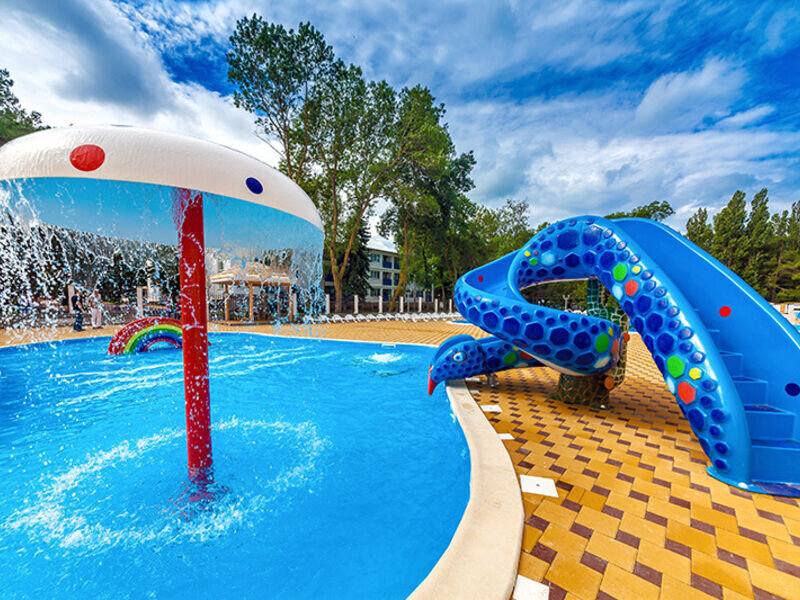 Отдельный бассейн для малышей с горкой и водными аттракционами оборудован рядом с бассейном для взрослых.