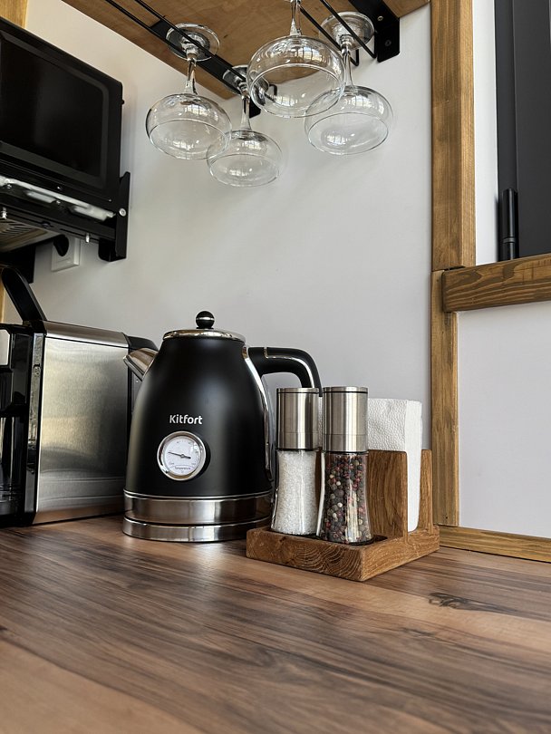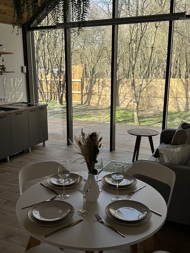 Дом площадью 45 м² полностью оснащен для комфортного проживания. В нем есть кухня, полностью оборудованная бытовой техникой и посудой, удобные спальные мести и средства гигиены, тёплый пол и две сплит-системы, высокоскоростной интернет 100 Мбит/c, умная колонка Алиса и проектор со встроенными приложениями.