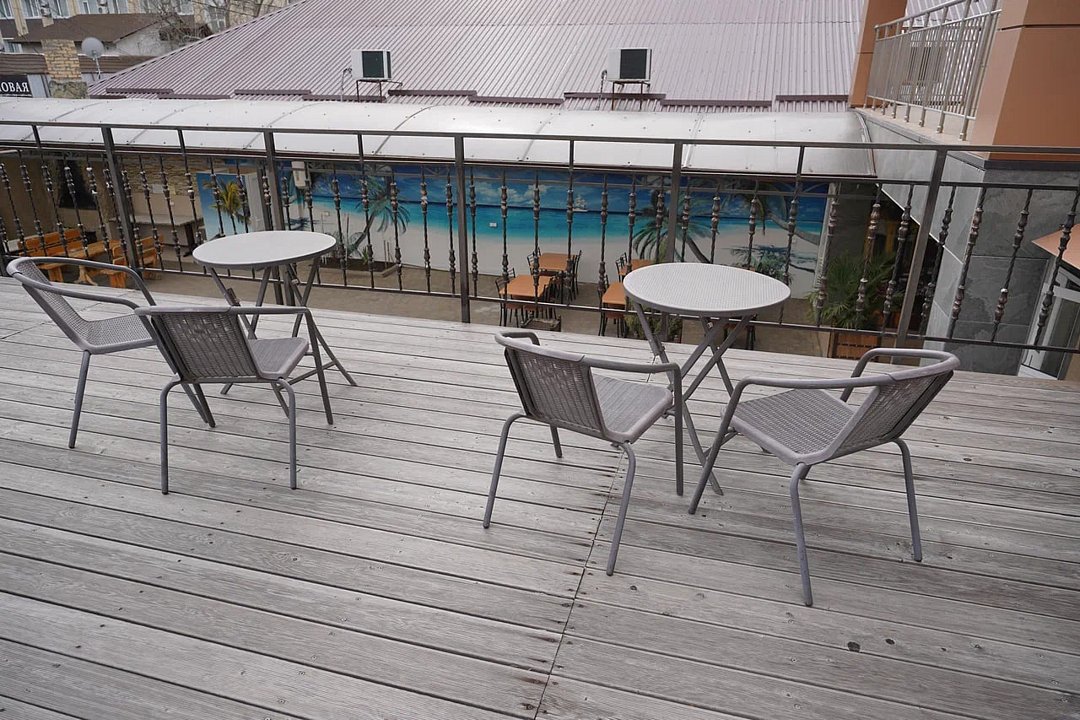 На территории обустроен двор с подогреваемым бассейном, зона отдыха с мангалом и несколько кухонь, где гости могут готовить самостоятельно.