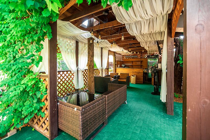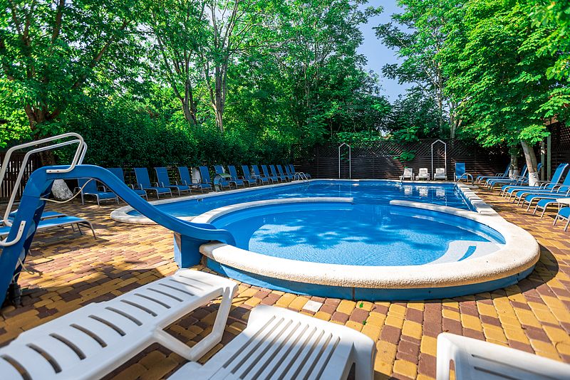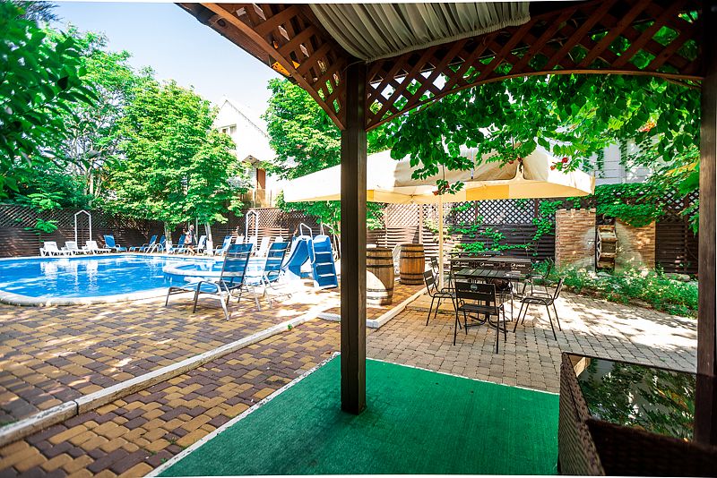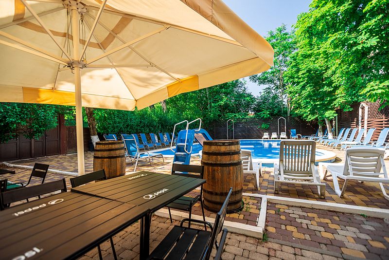Во внутреннем дворе нашего пансионата вас ждет летний бассейн с пресной водой для взрослых и специальный детский бассейн для маленьких гостей. Для тех, кто любит загорать и греться на солнце, предусмотрены шезлонги. Рядом с бассейном есть летний бар, в котором можно перекусить и отдохнуть.