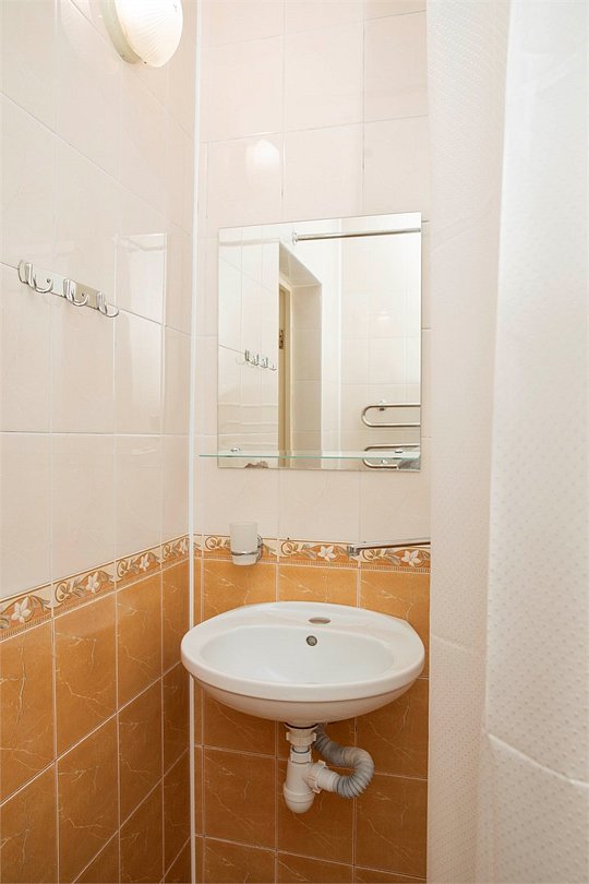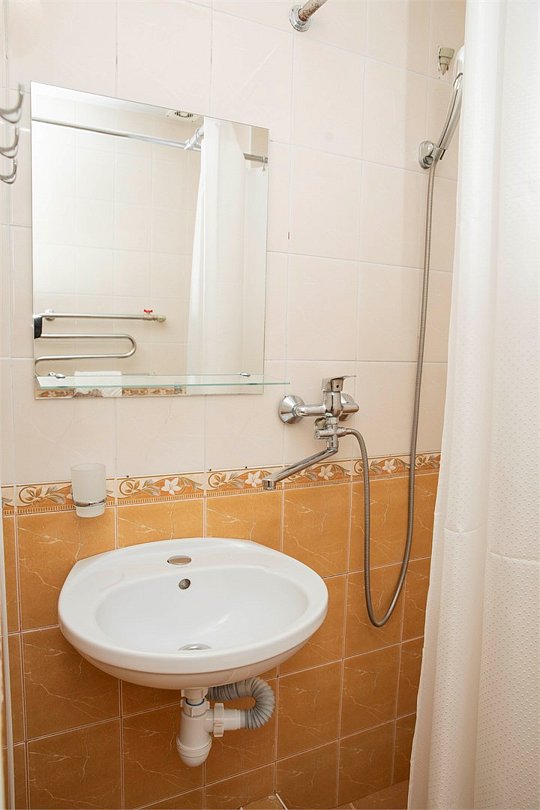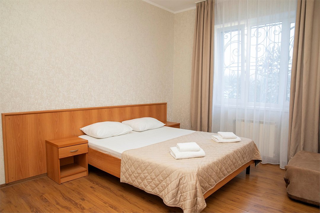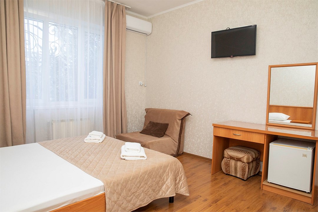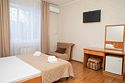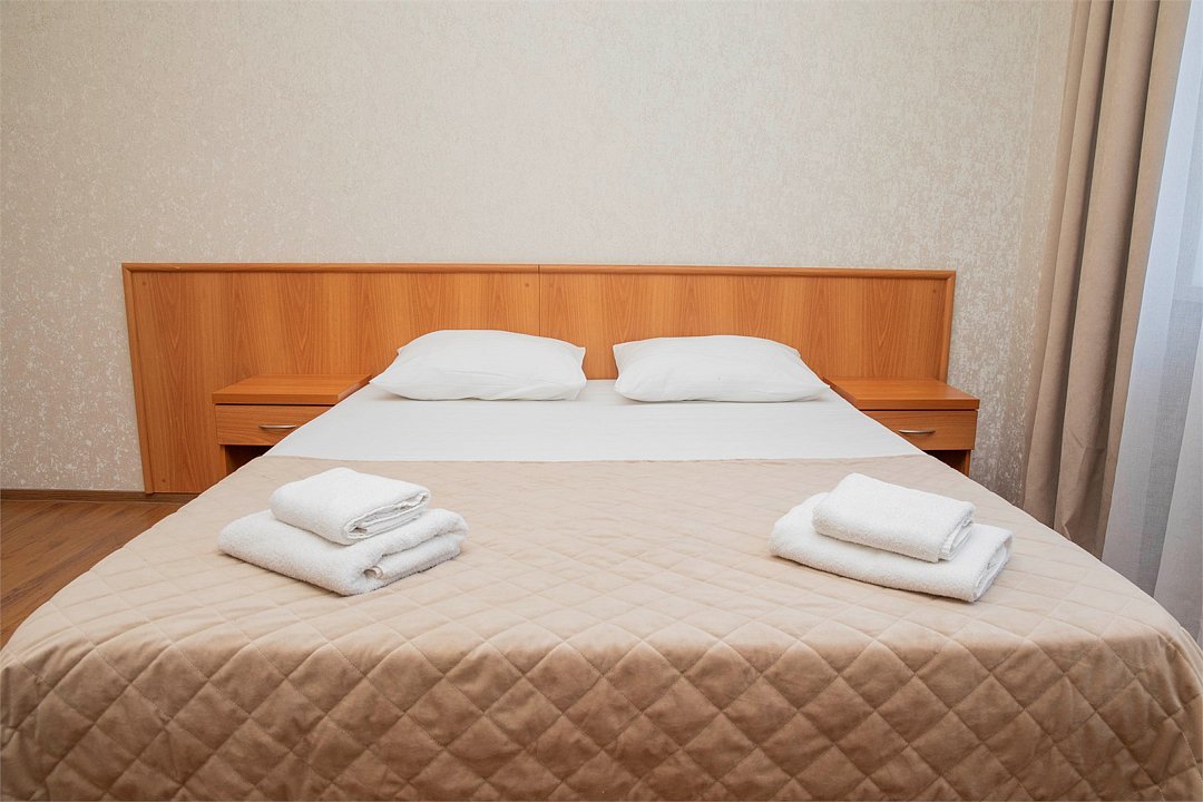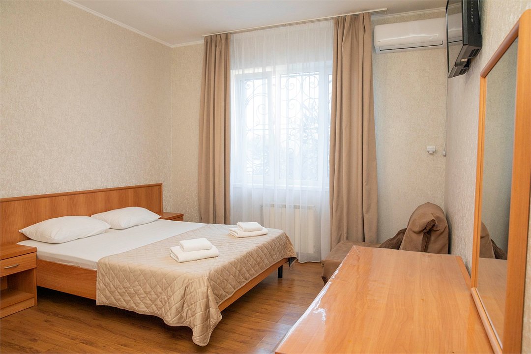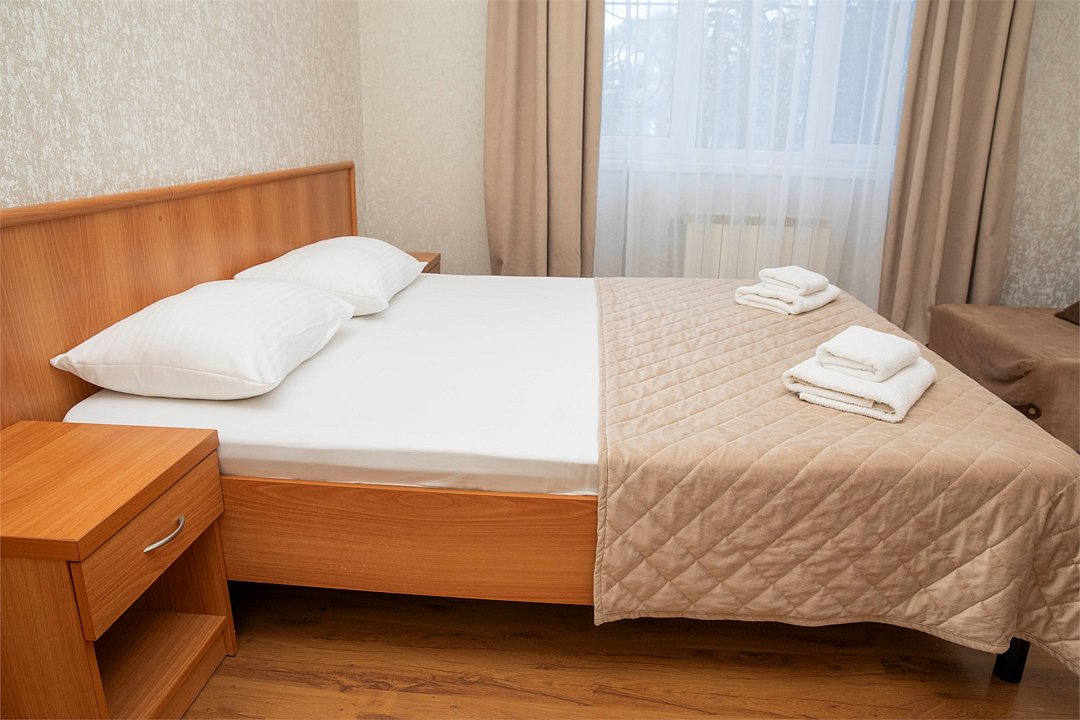 Однокомнатный номер категории комфорт. Расположен на первом этаже отеля, вид из окна во двор. Номер позволяет разместить 3 гостей. Оснащён одной двуспальной кроватью и креслом-кроватью. Шкафом, туалетным столиком, зеркалом, телевизором, холодильником и феном. Собственная ванная комната в номере.Услуги и удобства