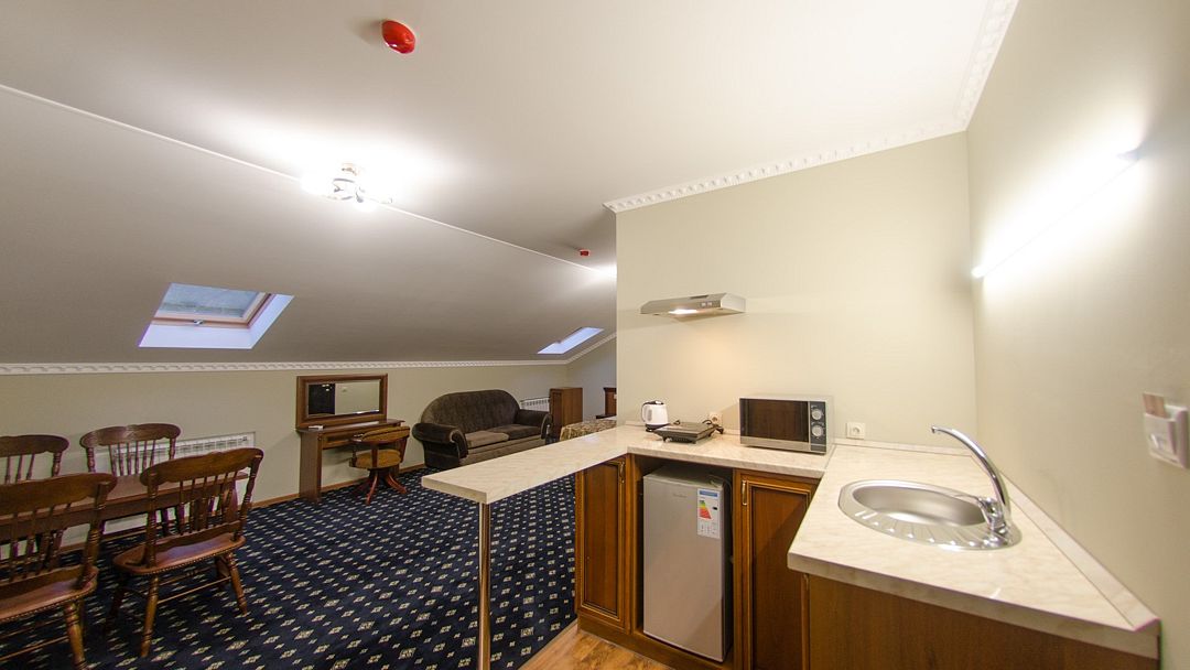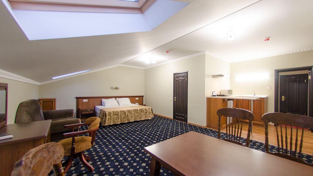 Здание гостиницы представляет собой красивый 3-этажный особняк с мансардой в псевдобританском стиле, оригинальность которого подчеркивает стильный фасад с отделкой под кирпичную кладку и оригинальное кованое ограждение балконов. На первом этаже отеля находится стойка администратора-портье, бассейн, сауна, а также 2 номера. На втором и третьем этаже располагаются номера категорий Стандарт, Студия и Люкс.