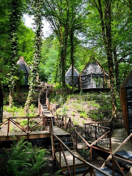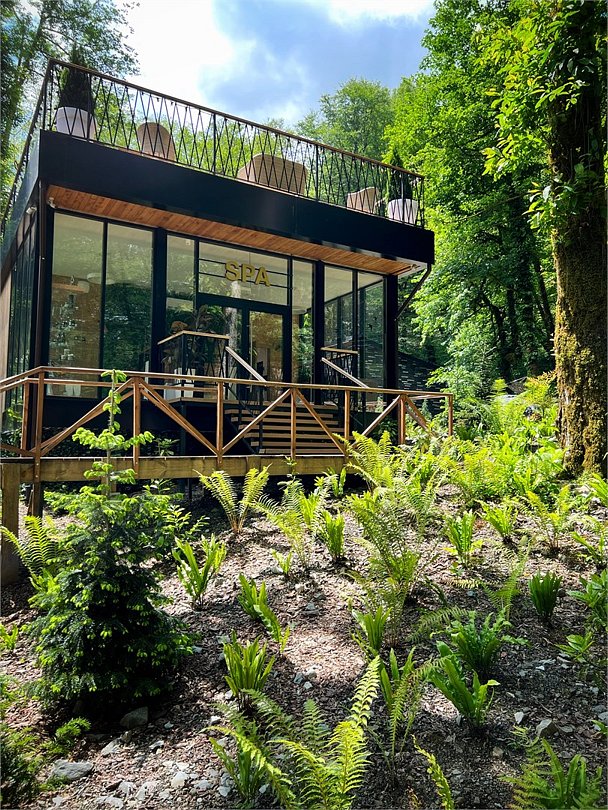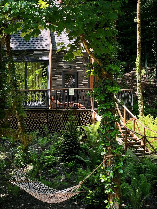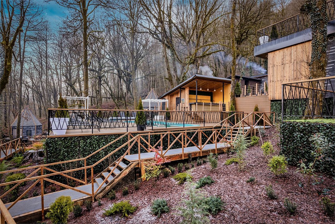 Уютный, отдельно стоящий коттедж с большими панорамными окнами и видом на реликтовый лес (35 кв.м) Оснащен всем необходимым для комфортного отдыха: -Панорамные окна с видом на лес; -Собственная терраса; -Большая двуспальная кровать; -2 кресла; -Столик; -Халат и тапочки, косметические принадлежности; - Санузел и душ в каждом домике. Зарядись энергией Кавказских гор и нарзанных источников!Услуги и удобства