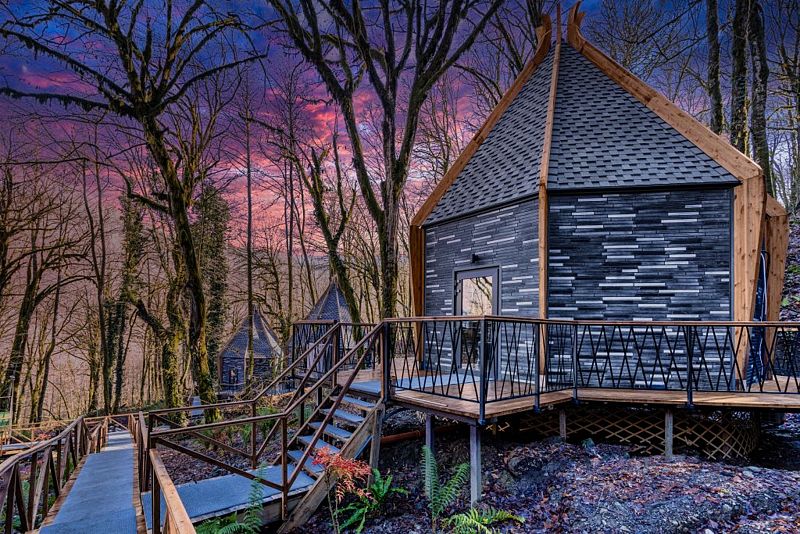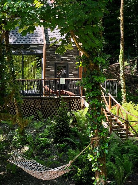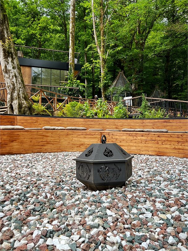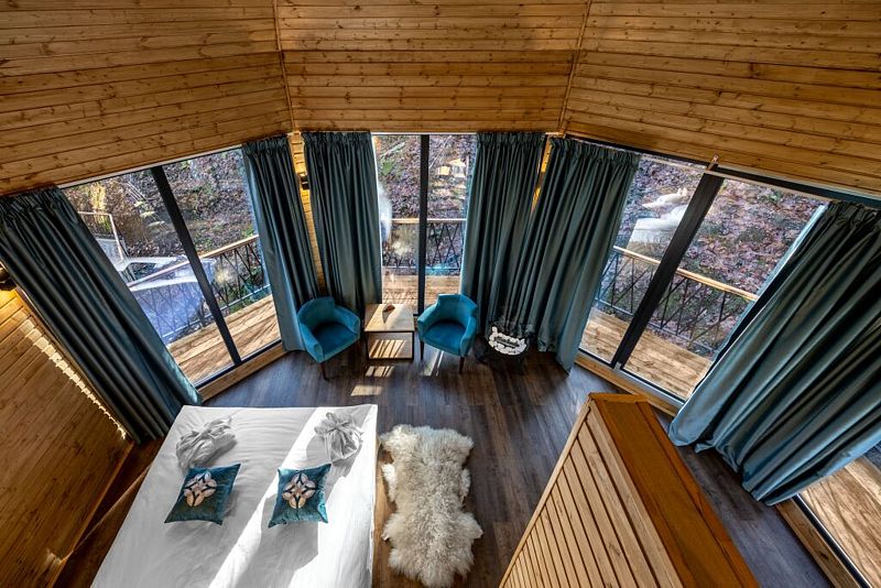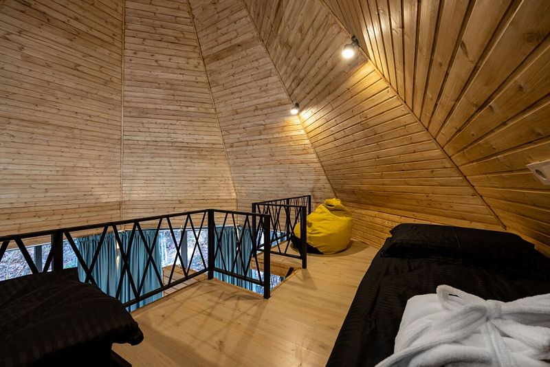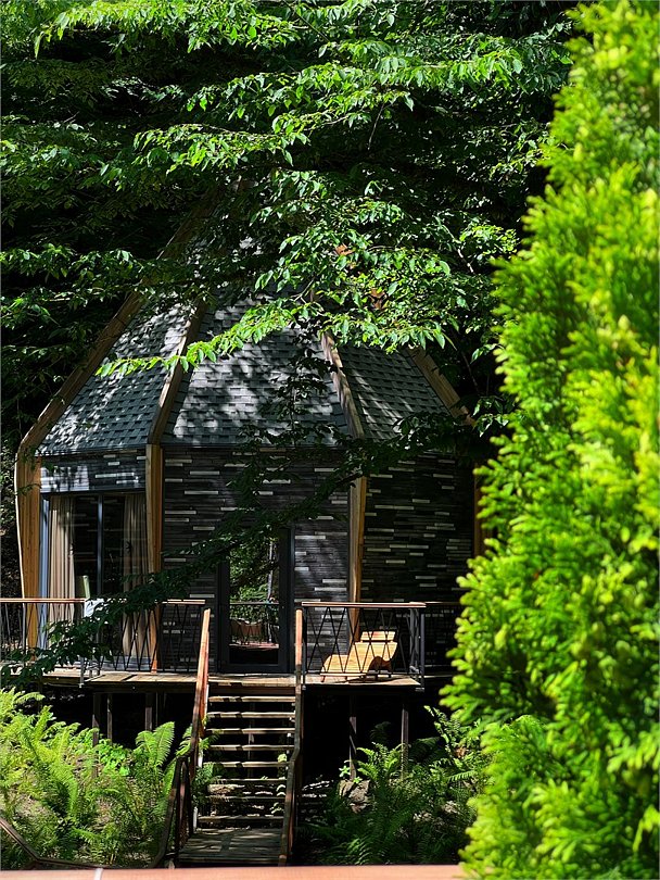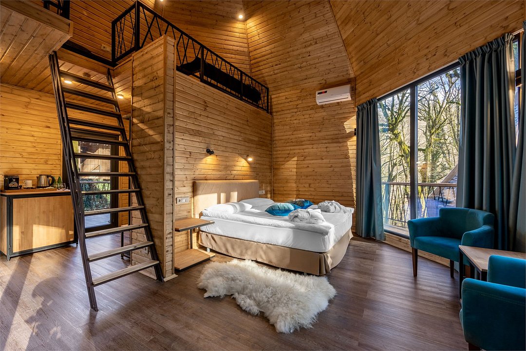 Уютный, двухуровневый, отдельно стоящий коттедж с большими панорамными окнами и видом на реликтовый лес (45 кв.м.) Оснащен всем необходимым для комфортного отдыха: -Панорамные окна с видом на лес; -Собственная терраса; -Большая двуспальная кровать ; -На 2-м этаже (10 кв.м) 2 отдельные кровати; -2 кресла; -Столик; -Шкаф для одежды; -Халат и тапочки, косметические принадлежности; - Санузел и душ в каждом домике.Услуги и удобства