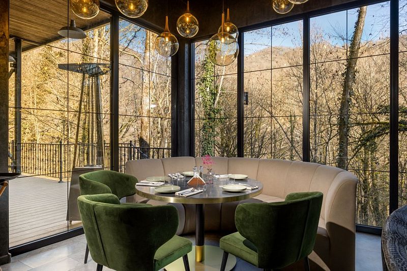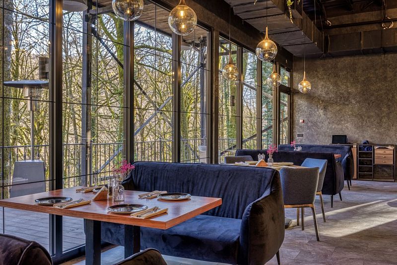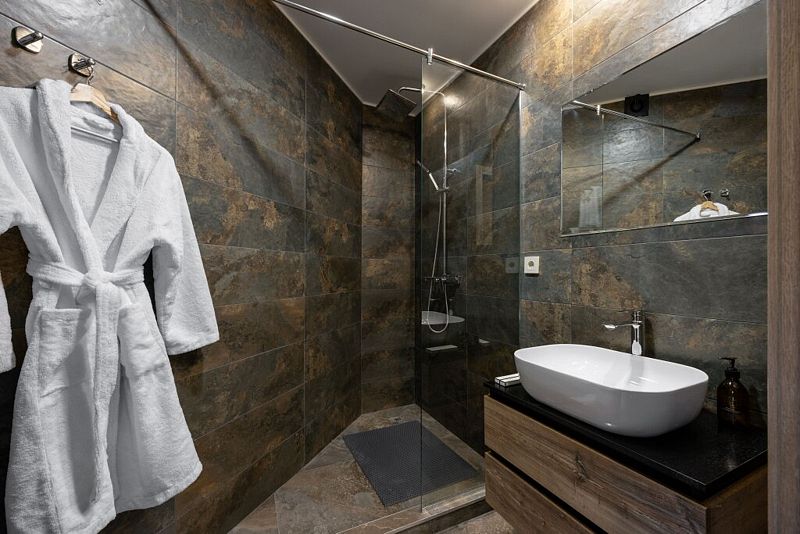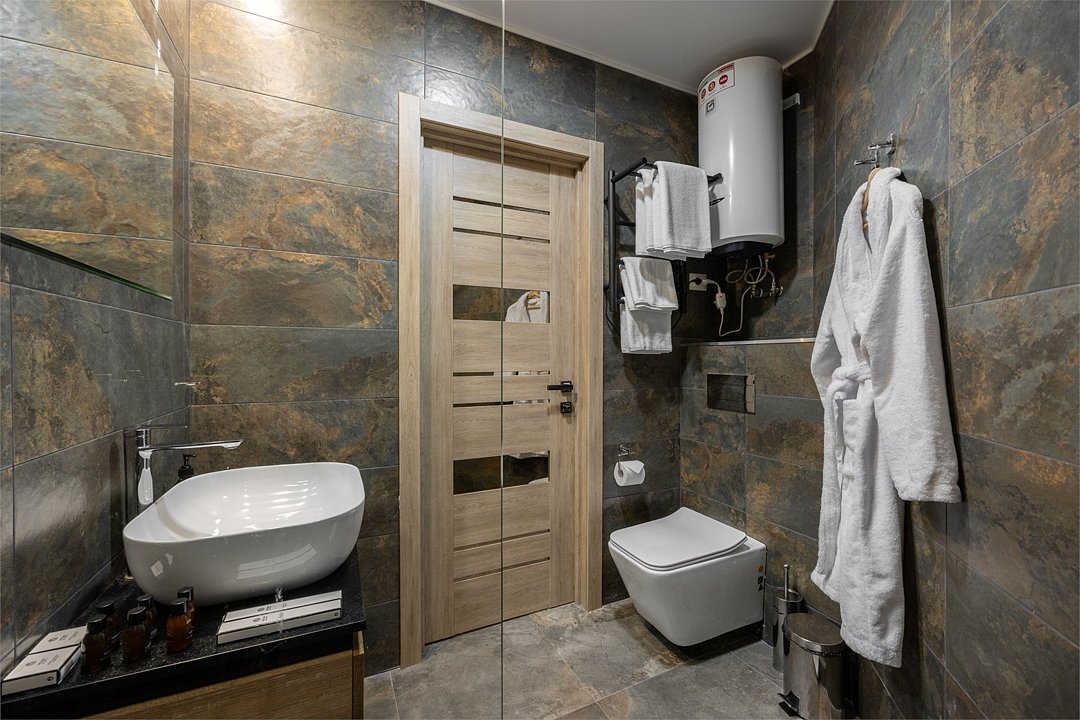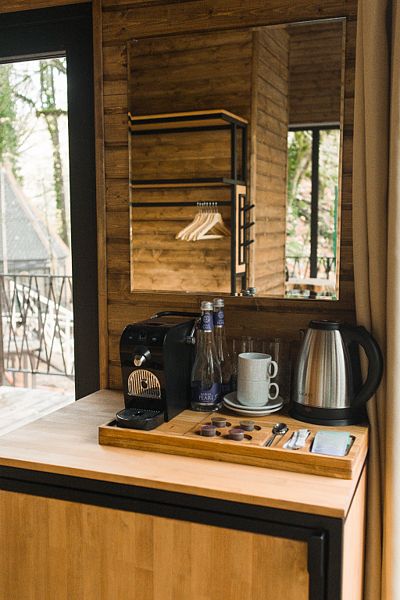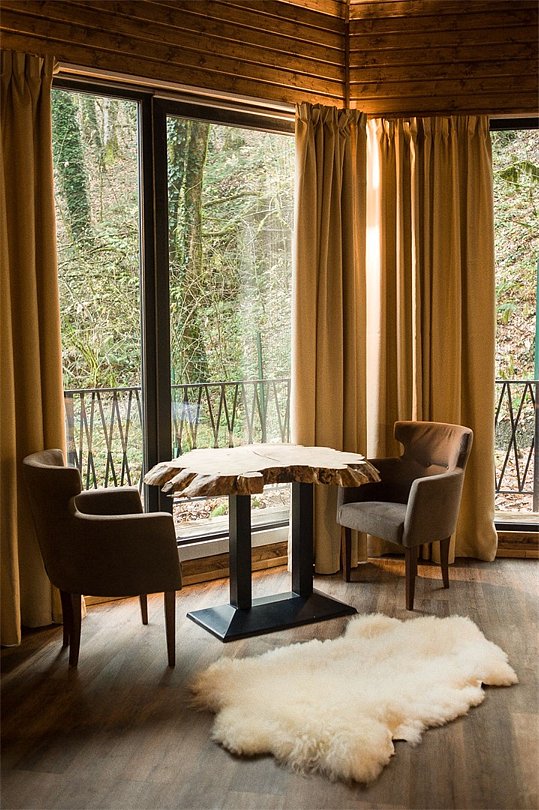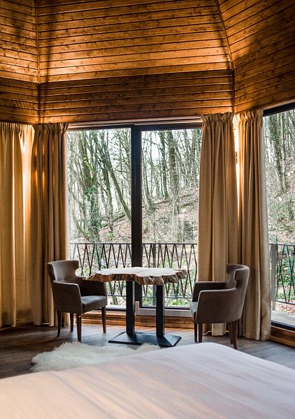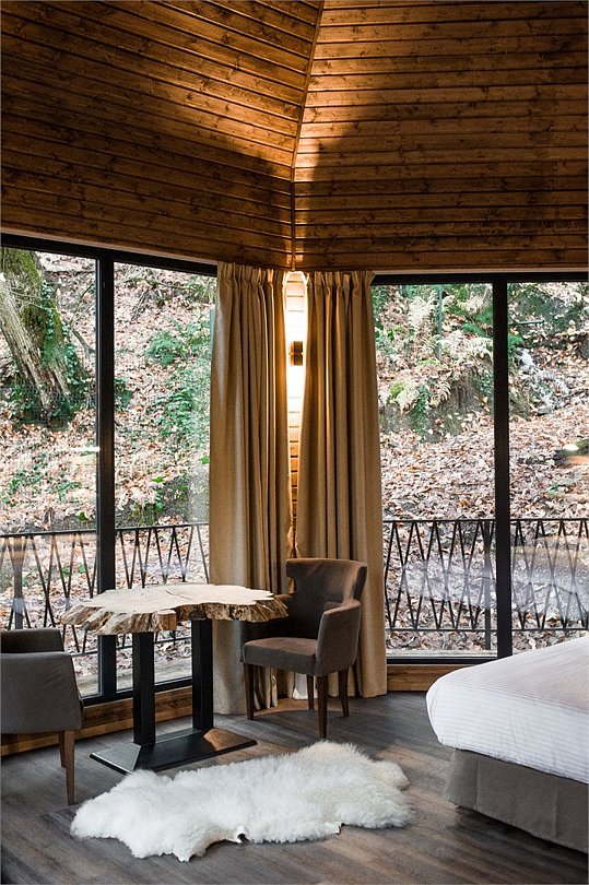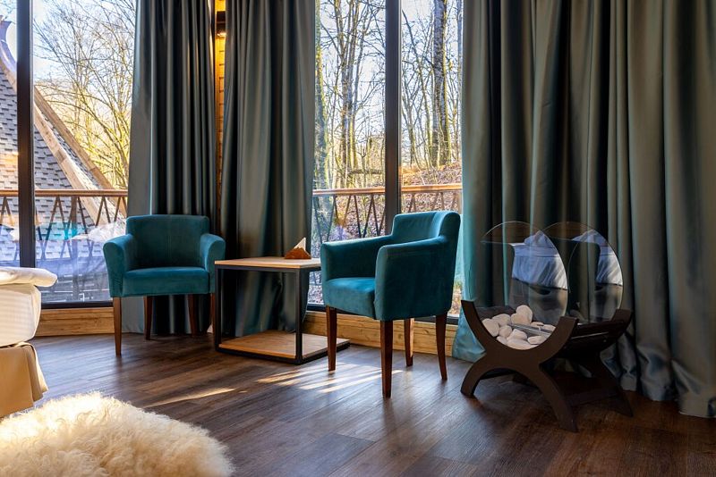 Wi-Fi, фен, душевая кабина, халаты, банные полотенца, тапочки, косметические средства, терраса, двуспальная кровать, две односпальные кровати, кресла, тумбы, вешалки, журнальный столик, зеркало, обслуживание номеров, раковина, отдельный вход в номер, туалетные средства, панорамные окна, номер для некурящих, вид на лес, общественный бассейн, чайная станцияВ гостиничном номере