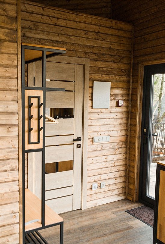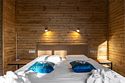 Wi-Fi, фен, душевая кабина, санузел, халаты, банные полотенца, тапочки, косметические средства, терраса, двуспальная кровать, кресла, вешалки, обслуживание номеров, косметическое зеркало, душ, высокие потолки, стол, тумба, панорамные окна, номер для некурящих, вид на лес, общественный бассейн, чайная станцияВ коттедже