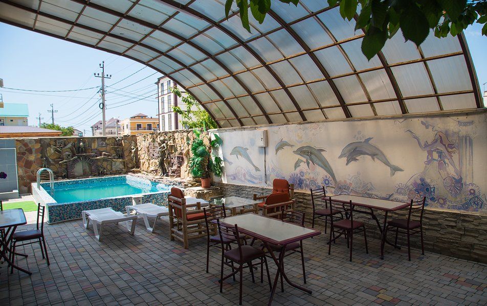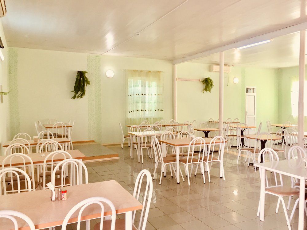Питание гостей организовано в столовой гостевого дома. В зале выставлены высокие стульчики для кормления малышей. Кроме столовой, в гостевом доме работает летнее кафе.