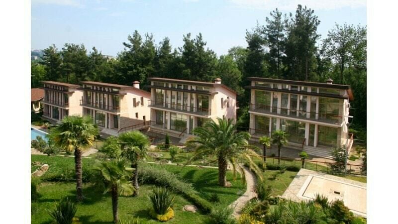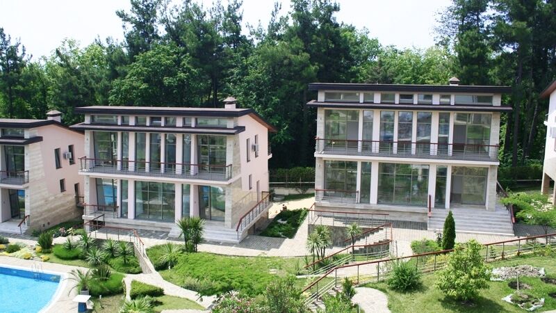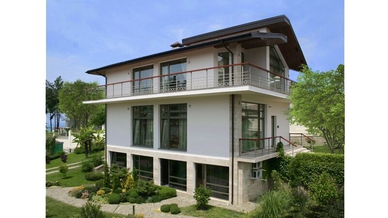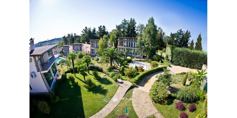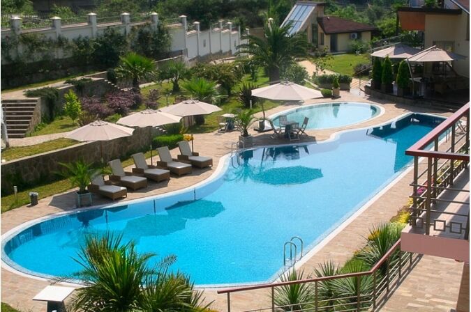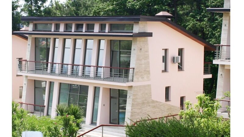 С трех сторон дом окружен застекленным панорамным балконом. Во дворе дома удобно расположены зоны отдыха: барбекю, взрослый и детский бассейны, теннисный корт, зона отдыха с шезлонгами в оазисной парковой зоне. До моря можно добраться пешком, так как расстояние в 550 метров. Ресторан в непосредственной близости.