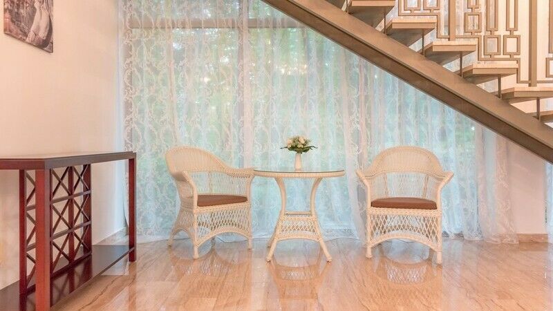 В комнате отдыха установлена мягкая и плетеная мебель.