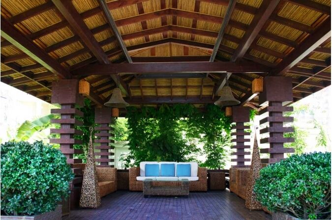 Беседка выполнена из натурального дерева и бамбука, покрыта высококачественной гибкой черепицей.
