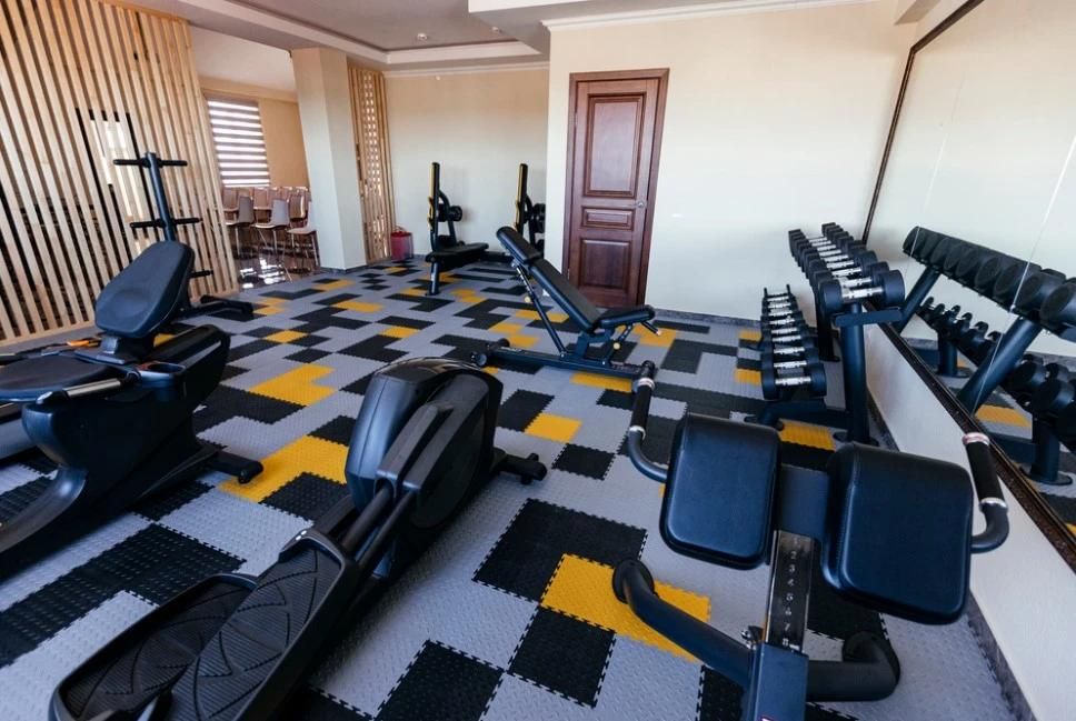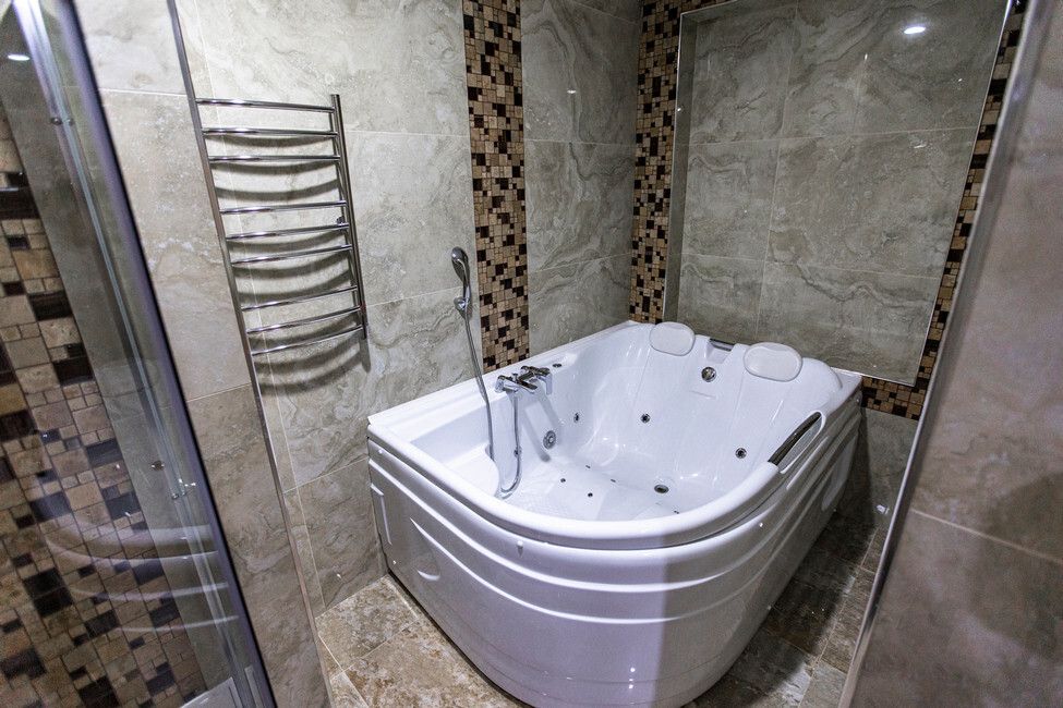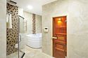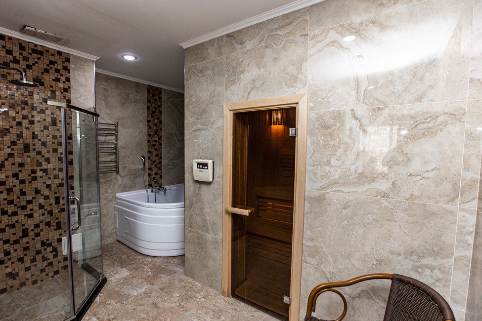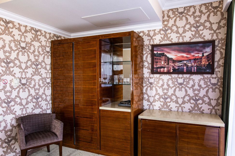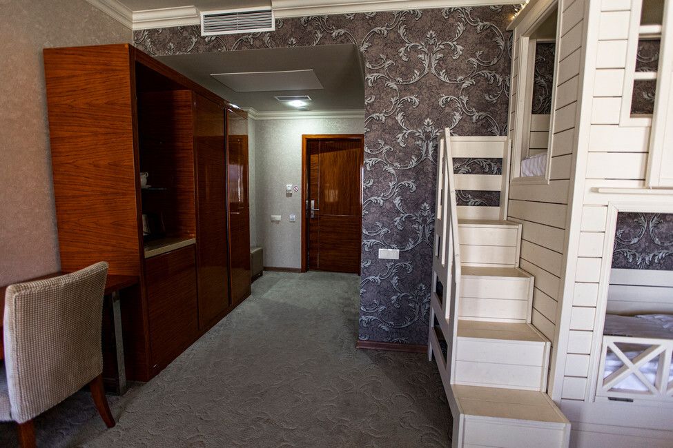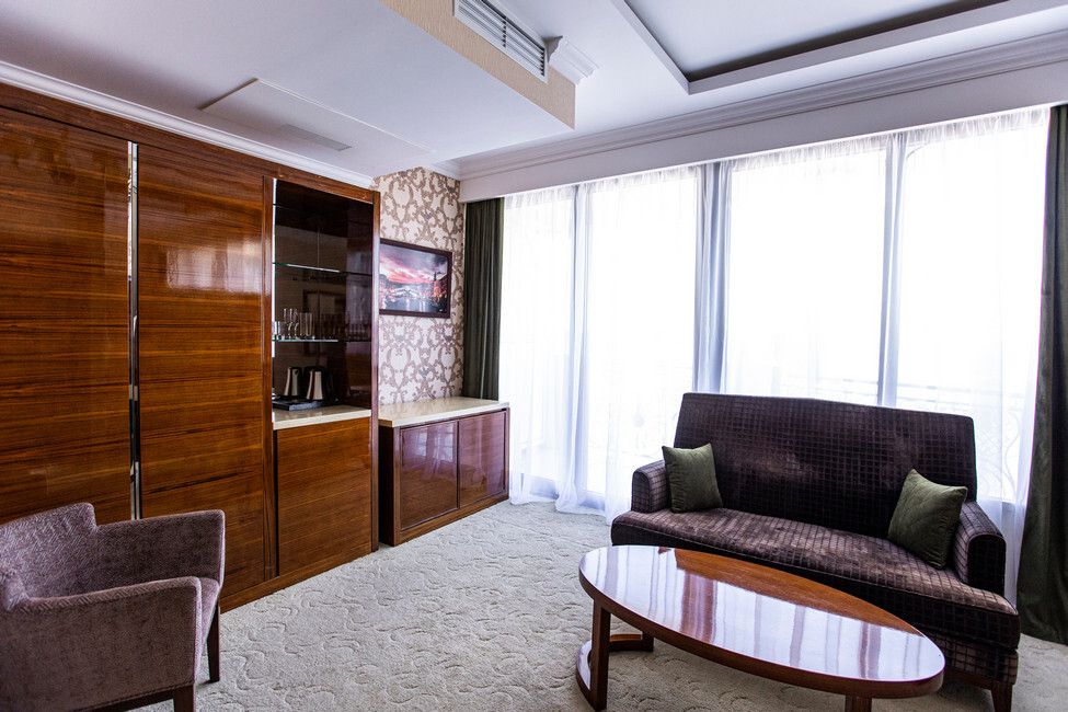 Wi-Fi, кондиционер, душевая кабина, гидромассажная ванна, банные принадлежности, халаты, банные полотенца, тапочки, гигиенические средства, косметические средства, сауна, кровать «Queen size», диван, кресла, шкаф для одежды, вешалки, журнальный столик, письменный стол, стол для переговоров, багажная тумба, зеркало, пуфики, мебельный гарнитур, две комнаты, чайный набор, набор посуды, сейф, чайник, унитаз, питьевая вода, ковровое покрытие, вид на город, меню подушек, стаканы, столовые приборы, кофейный столик, туалетные средства, туалет, телевизор с плоским экраном, шкаф-купе, гостиничная парфюмерия, без питомцевВ гостиничном номере