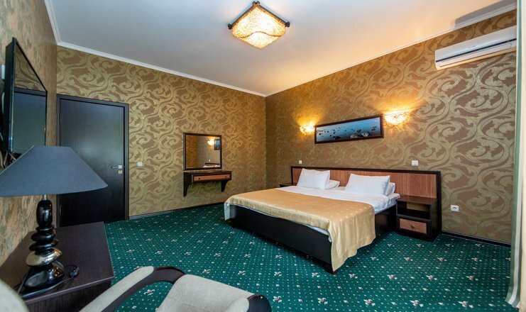 2-спальная кровать, прикроватные тумбочки, стол, стулья, шкаф, зеркало, вешалка, ЖК ТВ, мини-холодильник, кондиционер.
