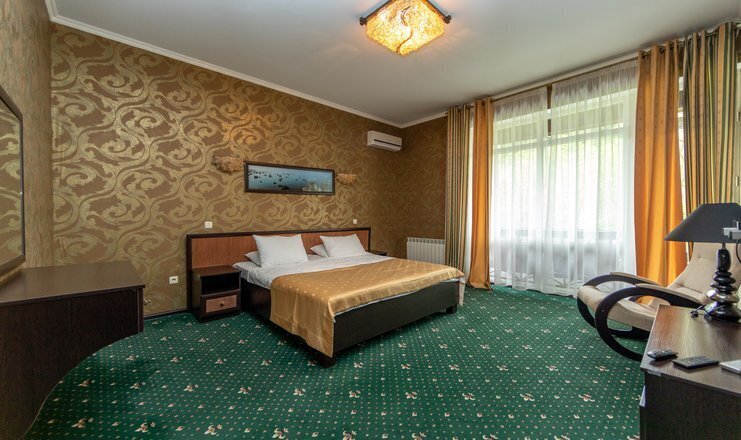 В номере есть балкон, с которого открывается живописный вид на горы и лес. На балконе установлены кресла и столик.